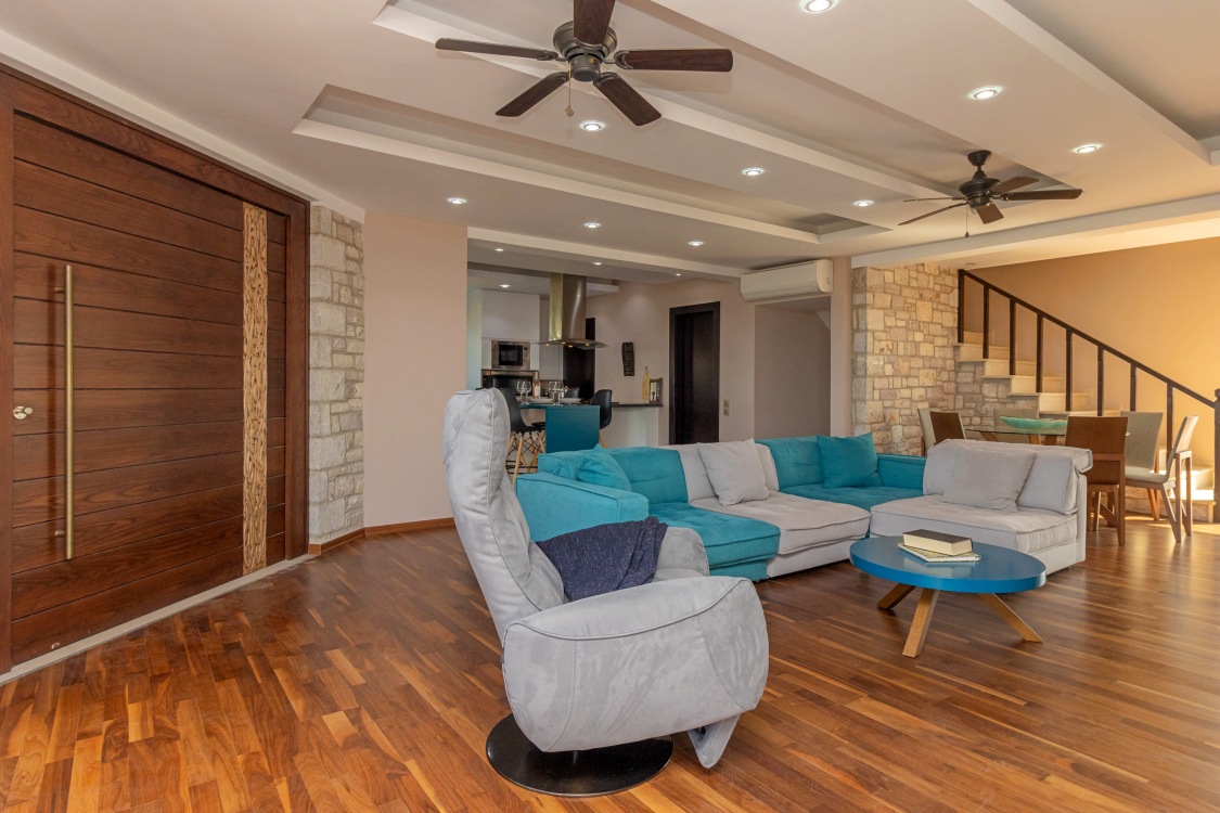 This magnificent 315 sqm villa was developed by a well-traveled architect on a 4127.82 sqm plot and offers breathtaking views of the Mediterranean Sea. The middle floor measures 101 sqm and consists of an open plan living room with fireplace, dining area, and a modern fully equipped kitchen; an office room, and a guest WC. From the living room and the kitchen, you have access to a terrific spacious covered veranda, where you can enjoy stunning views of the sea, the sunset, the castle, and the t...