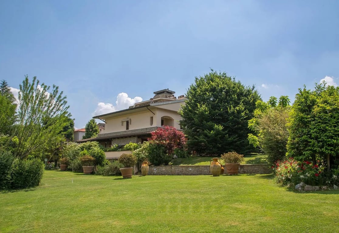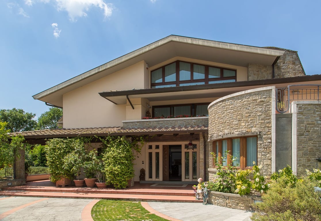 Luxury villa with swimming pool located within a very private residential context, in a hilly position a few km from the city of Arezzo.The recently built villa is on three floors, has a surface area of 1,000 square metres and consists of two residential units. Since the two units are connected, it is possible to easily create a single property.The first unit is larger than the other and is composed as follows.The basement part houses a tavern with kitchen, fireplace room, cellar, vault, two bat...