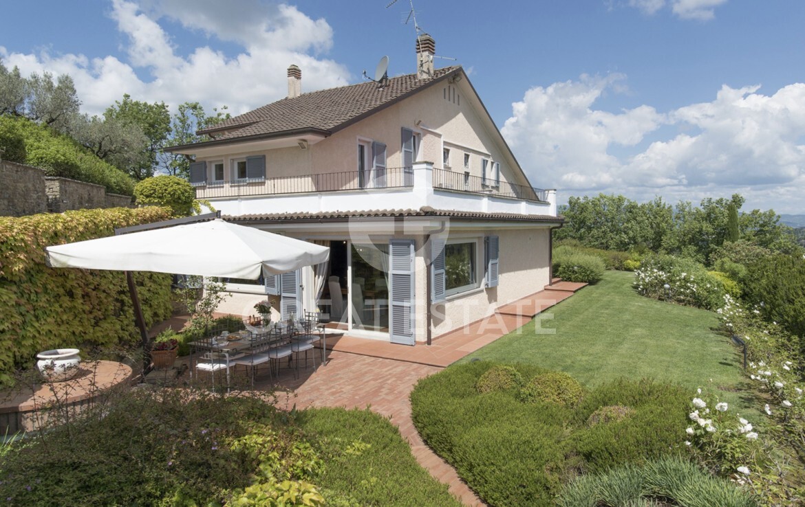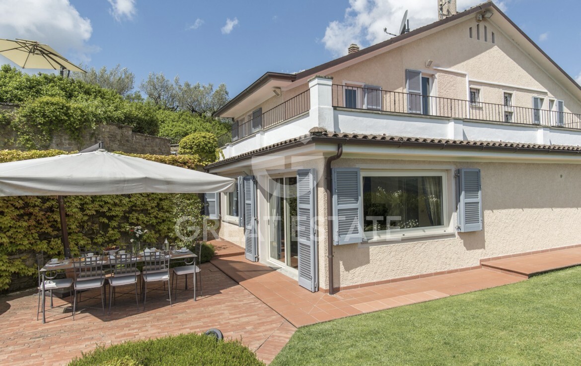 The property is composed of the main villa of approximately 325 square metres and the dependance of approximately 270 square metres that are developed adapting to the hilly morphology of the land, both with possibly private access and gardens on different levels that give total privacy to the two dwellings. Inside, the main villa is spread over two floors, both of which have external access and are located adjacent to the driveway. On the ground floor, there is a large living area consisting of...