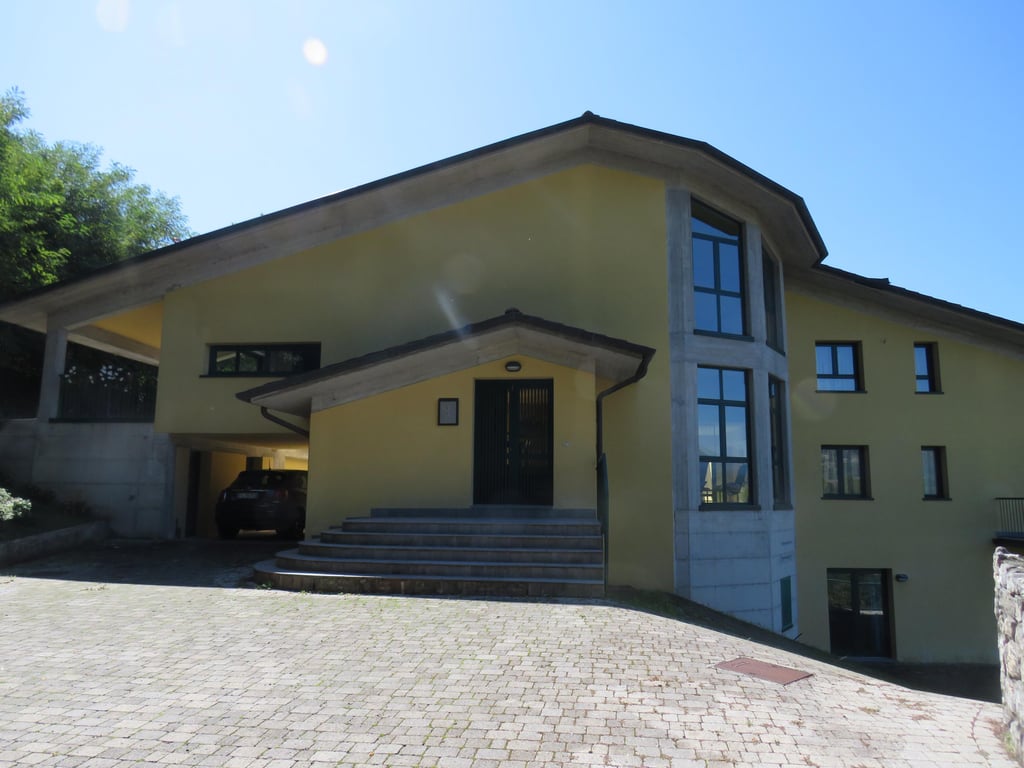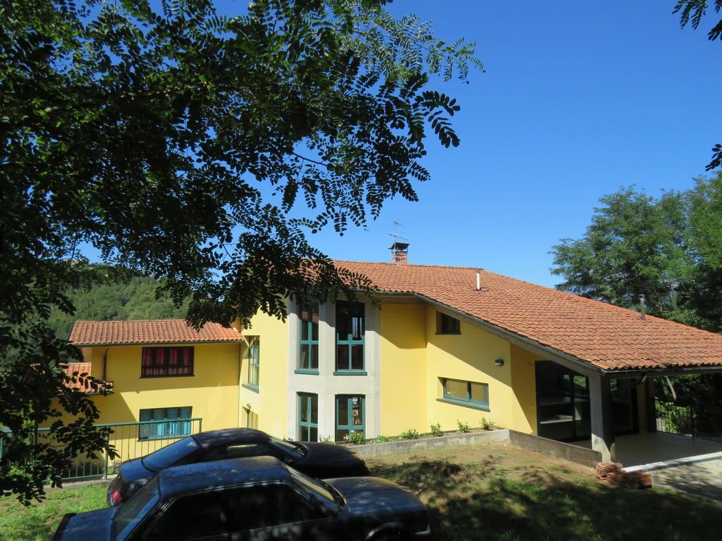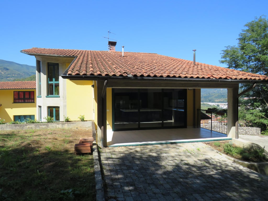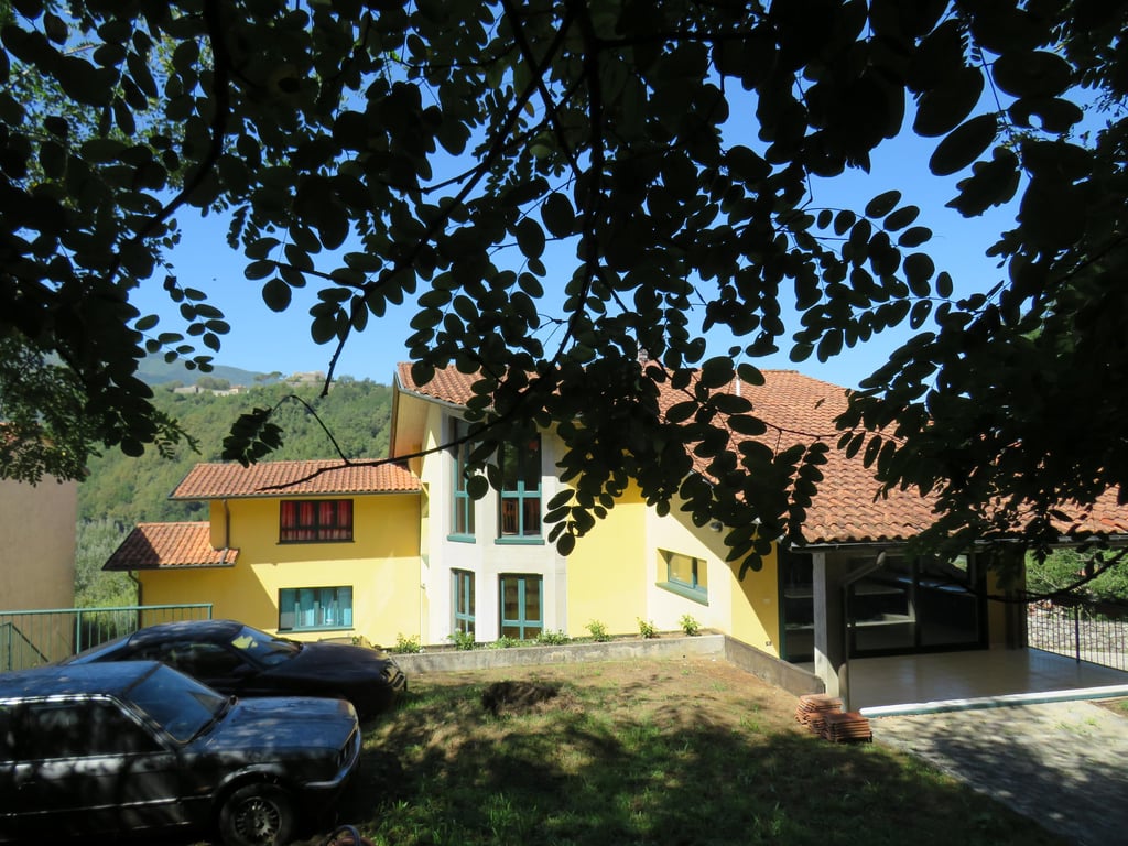Detached private villa, divided into 2 units, situated in the exclusive residential area of San Carlo in the outskirts of Castelnuovo di Garfagnana, Large garden with Garage. Habitable Surface area 470 sqm plus 2 cellars. Access by private driveway, parking area and surrounding garden with space for swimming pool. Special features : Large semicircular windows overlooking the medieval walls of Castelnuovo and the mountains behond. Interior Layout: Ground Floor - Split level Lounge with fire...