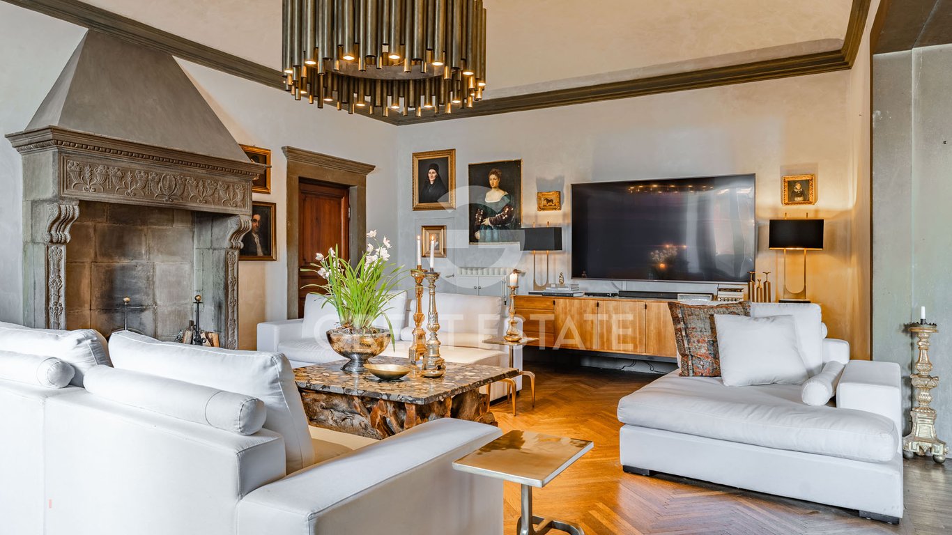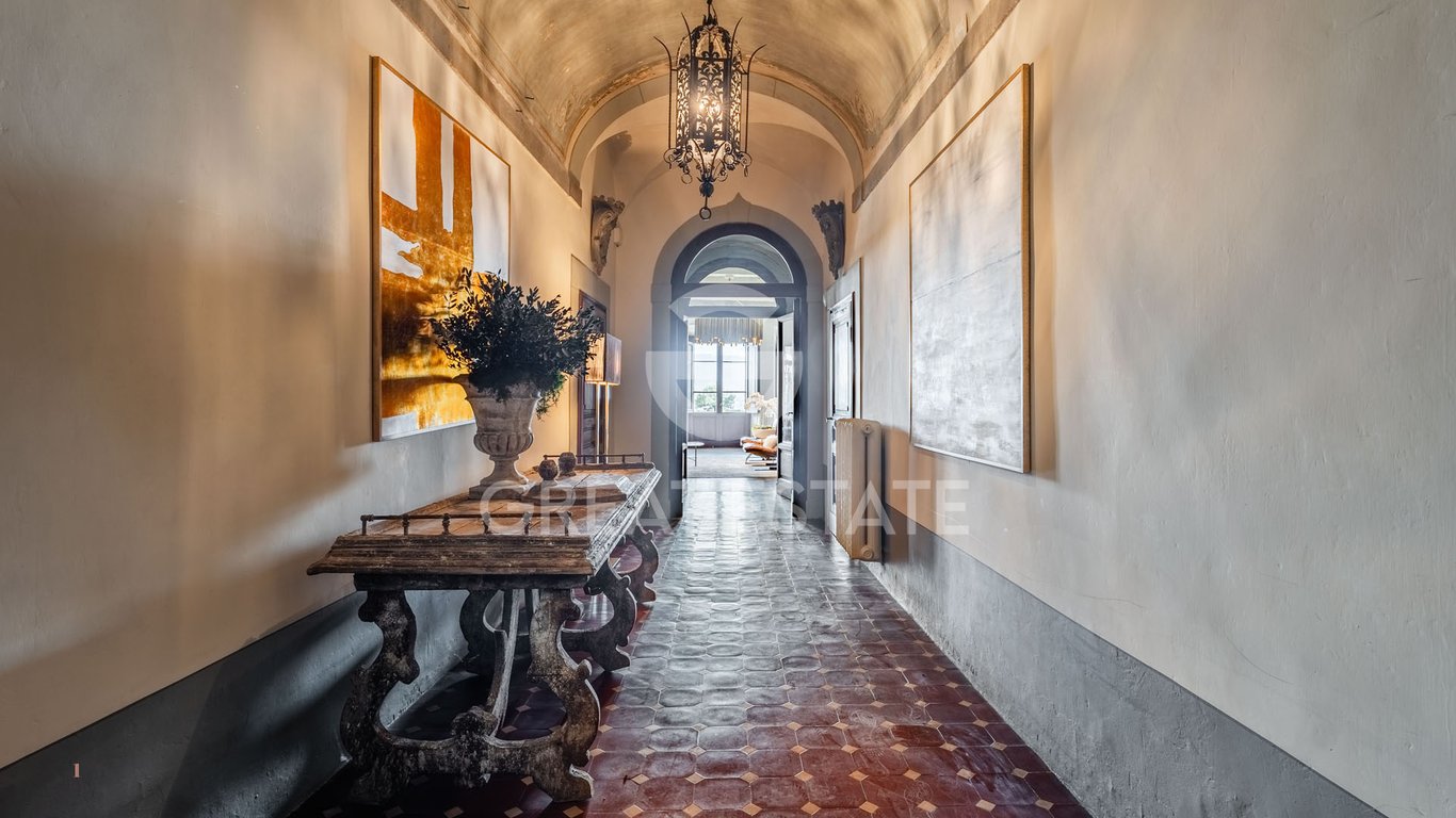 In the charming historic center of Castiglion Fiorentino, within the ancient walls and in a position of great appeal, stands this elegant 17th-century residence, finely restored, offering a surface area of approximately 511 mq and a splendid panoramic terrace overlooking the Tuscan hills and the Castle of Montecchio Vesponi. The entrance opens through a refined corridor leading to an impressive reception hall with a stone fireplace, period furnishings, and direct access to the terrace, creating ...