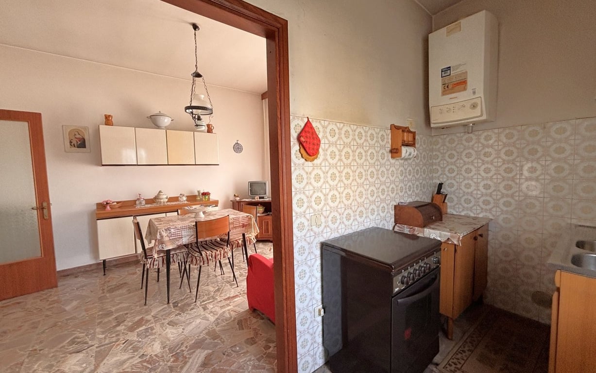 In convenient location close to all amenities, in two-family house, apartment on the first floor of approx. 120 sqm divided in entrance, dining room with access to the terrace and kitchenette, large living room with fireplace and access to the terrace, three double bedrooms, two of which with terrace and bathroom with bathtub.The property inlcudes two large attic rooms, one of which with fireplace, large garage on the ground floor, basement cellar, business premises of approx. 35 sqm, private ga...