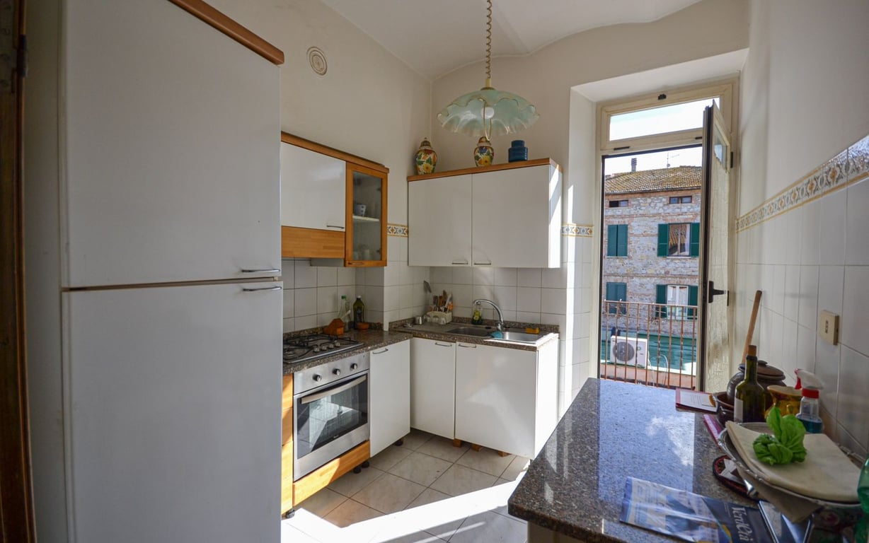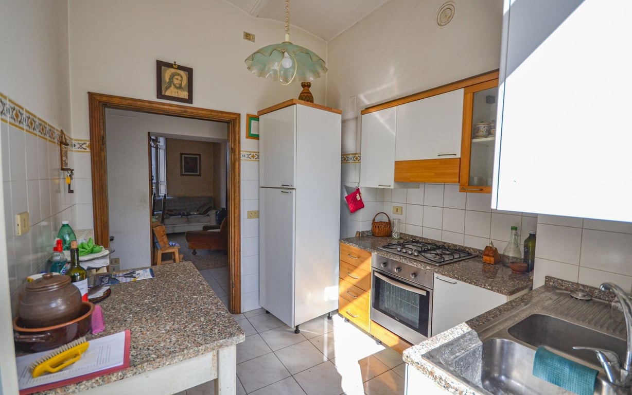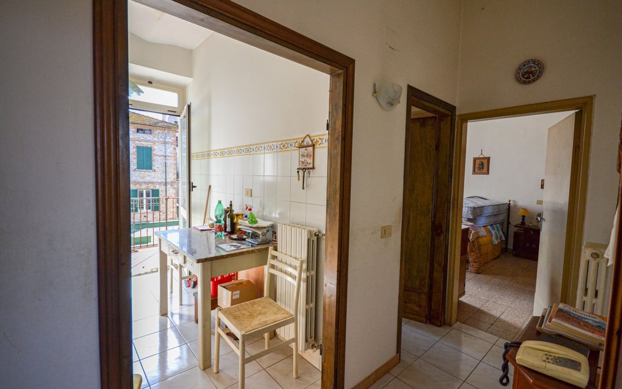 In central location, walking distance from all amenities, apartment on the second floor of approx. 65 sqm divided in entrance, large dining room with wood stove, habitable kitchen with balcony, two double bedrooms and bathroom with shower and tub.The property is in good general conditions and includes large room used as storage on the ground floor of approx. 14 sqm with double access and toilet as well as attic of approx. 14 sqm. Very bright.