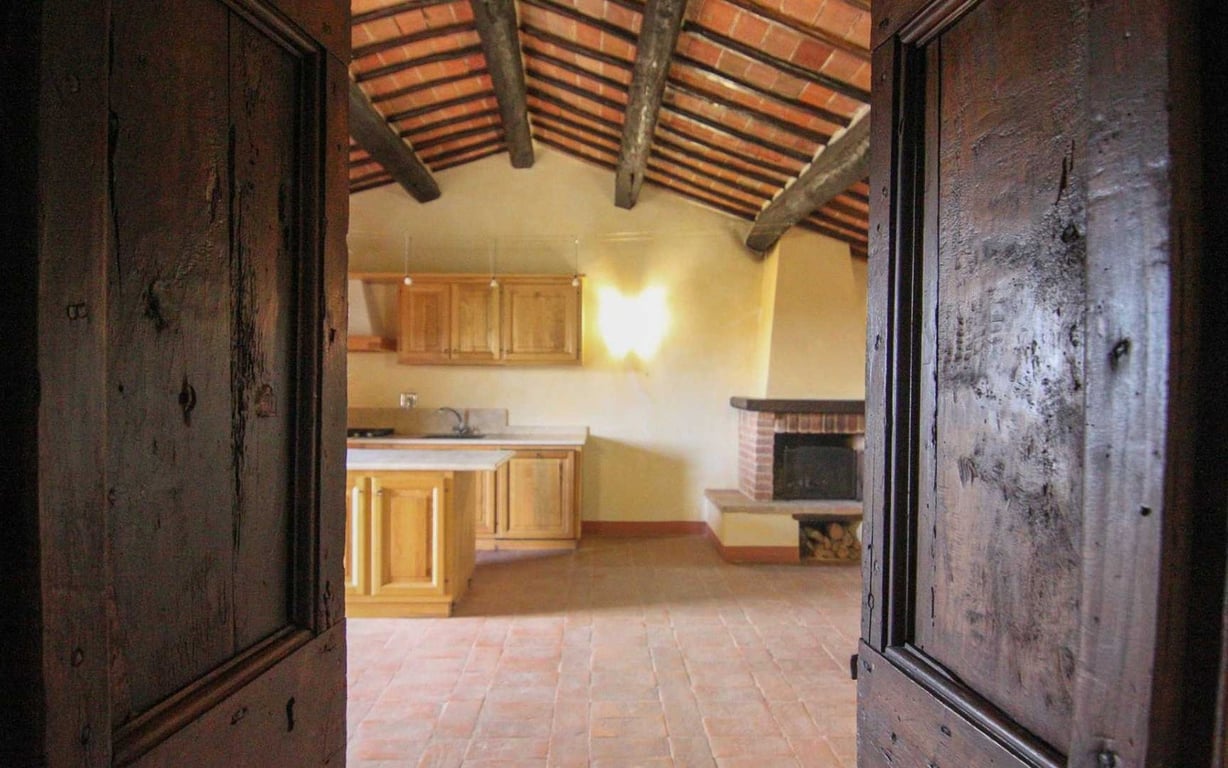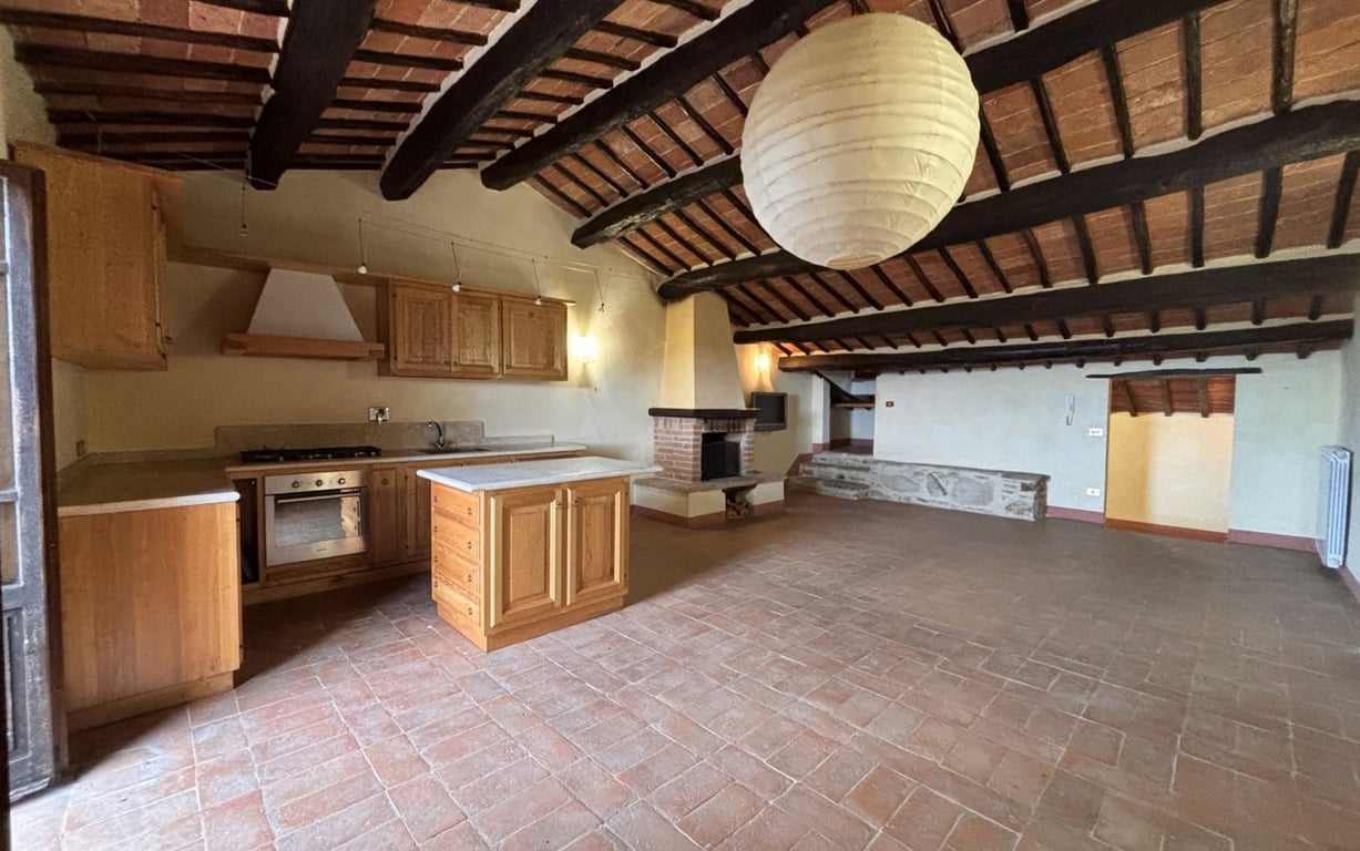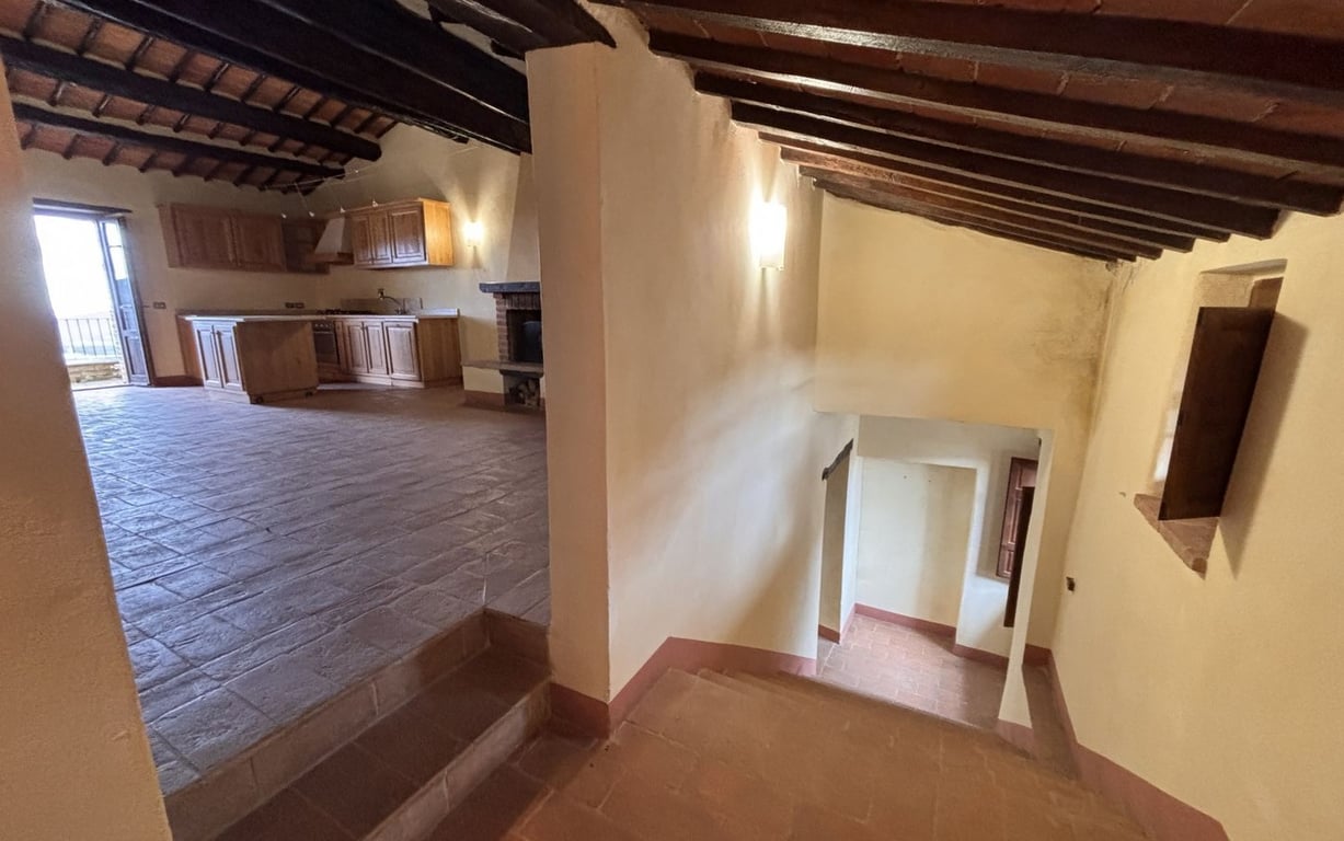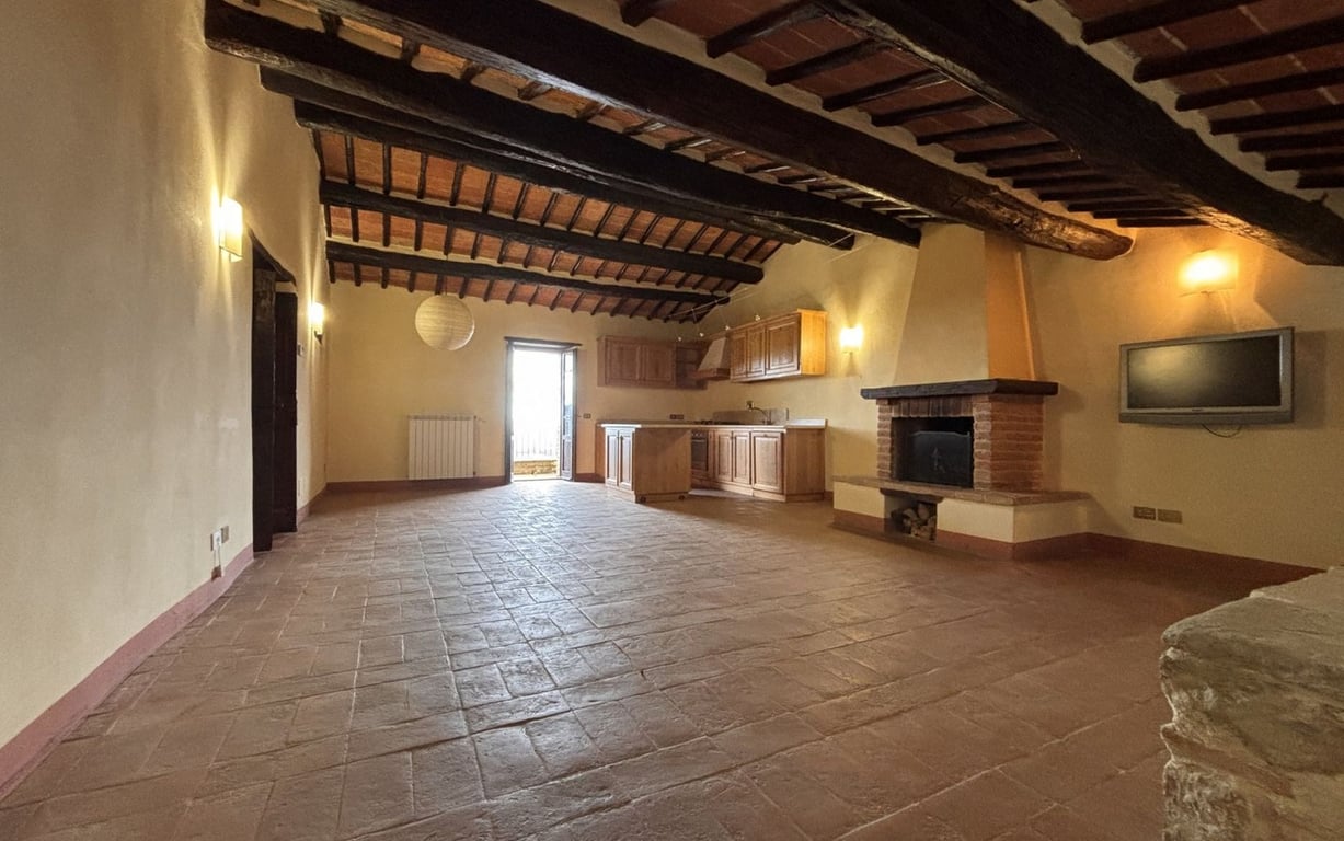 In a commanding position, nestled atop a hill, a beautifully renovated second-floor flat of approximately 80 square metres within an ancient village built of exposed stone. The property is accessed via a private staircase, at the top of which lies a spacious living room with a very airy and bright kitchenette, featuring a fireplace and a magnificent terrace with unobstructed views over Lake Trasimeno, two bedrooms and a bathroom with shower.Situated approximately 8 km from the main amenities, th...