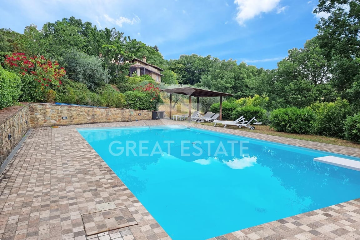 Casale dei Ritratti, is a beautiful stone farmhouse with panoramic views over the green hills of Monte San Savino. The property covers an area of 350 sqm on 3 levels. The property is accessed via a gravel path within the delightful garden that surrounds the property. An elegant and spacious portico with exposed stonework welcomes us to the ground floor, which consists of a large living room with fireplace, from which there is access to a large panoramic terrace with wooden beams, a kitchenette...