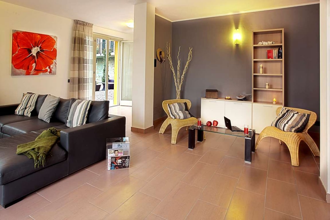 Tr 130-5 Griante: a large ground floor apartment situated in a small Residence of just 9 apartments and containing a swimming pool, sauna, hot tub and BBQ area The Property This large and bright ground floor apartment is set on two floors and benefits from a private garden. At the ground floor level there is a large living room with kitchen that opens onto the garden, a bathroom and a double bedroom (totalling 94 sq.m.) At the lower ground floor level there are 2 double bedrooms, a second...