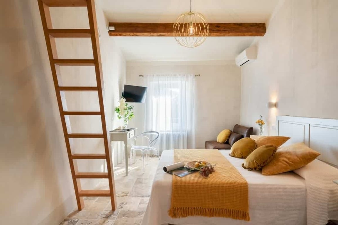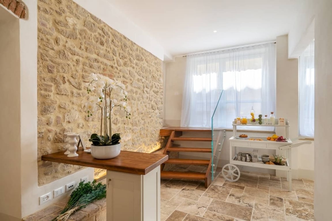 In the Tuscan countryside, a few minutes from the Coast, we sell part of a bigger building, set in a picturesque village. The building has been totally renovated and divided into 5 bedrooms with en-suite bathrooms, some of the bedrooms boasts a fantastic sea view. The first bedroom is situated on the first floor, it is 22 sqm and it boasts a living-area as well and a terrace with sea view. This room can be joined with the nextdoor 18 sqm bedroom with amazing vaulted ceiling, a double bed, a sofa...