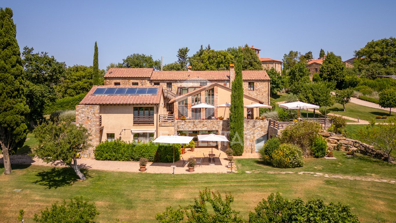 This luxurious residence is located in the municipality of Cinigiano, among the beautiful hills of the Maremma and consists of three buildings. The main house is 540 sqm on three levels, with a total of 10 rooms with ensuite bathroom, professional kitchen, living room with large windows, study, tavern, laundry, technical rooms and storerooms. The villa, measuring 180 square metres on three floors, has a beautiful living room with kitchen, two bedrooms, three bathrooms, garage, cellar, technical ...