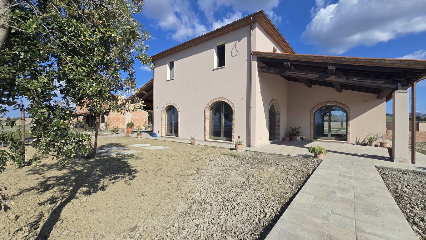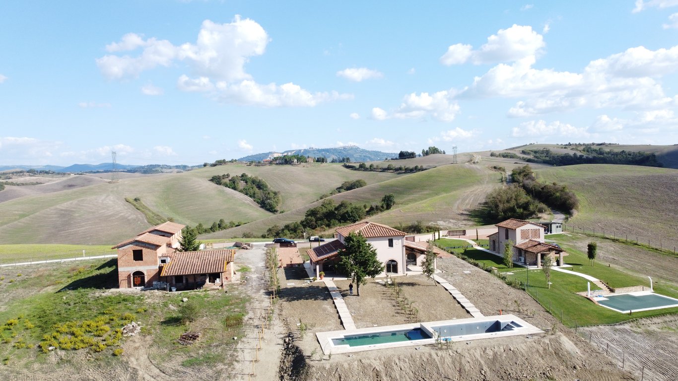 We sell two semi-detached houses in a complex among Volterra and Lajatico, at the top of a hill with a breathtaking 360° panoramic view. The estate is accessible through 2 km unpaved road. Lajatico village is 10 minutes by car and Volterra is 15 minutes. In the complex there are 4 buildings for a total of 5 houses, 3 of which have been sold and precisely: a detached villa with swimming pool, a big building divided into 2 houses and their private swimming pool and finally the 2 semi-detached hous...
