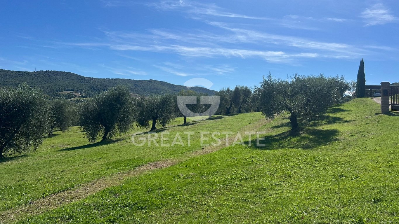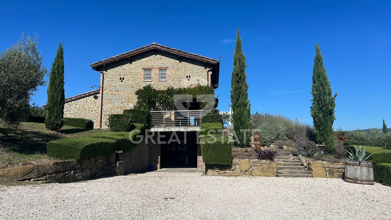 The enchanting natural stone house "Villa Gioia" is located in the village of Magione in of the province of Perugia and is only a few minutes by car from Lake Trasimeno, which in summer offers an attractive alternative to the sea. The house can be reached via an approx. 600-metre-long gravel path, through an olive grove that leads to the entrance gate adorned with cypresses. Just a few metres further there is 3 cars covered parking spaces and the staircase to reach to the main entrance. The "Vil...