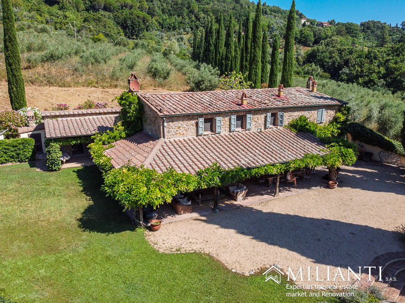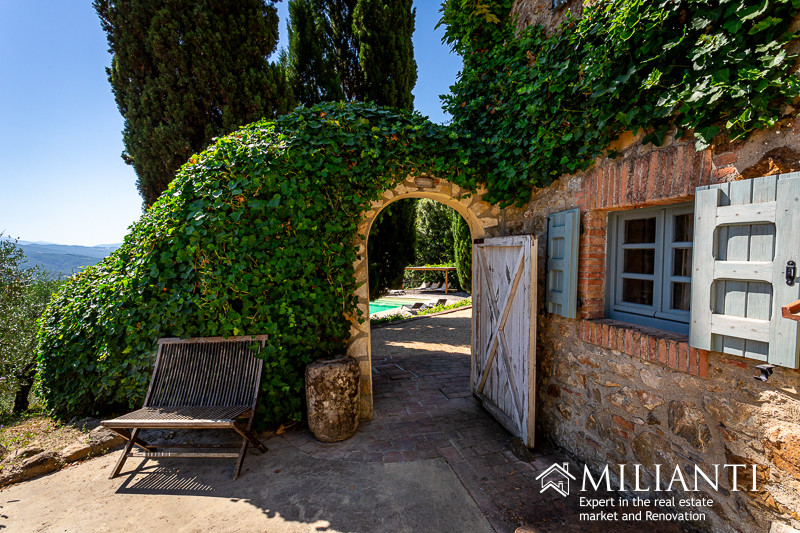 In Montecatini Val di Cecina municipality, fully immersed in the unspoiled countryside we sell authentic farmhouse with panoramic swimming pool and 5 hectares of land with a huge olive groove. The house is accessible through 600 meters unpaved road and a picturesque cypresses lined path which leads to the parking area. The villa has been entirely and tastefully renovated by the current owners, maintaining its original Tuscan features such as the exposed stones and bricks on the outdoor walls, th...