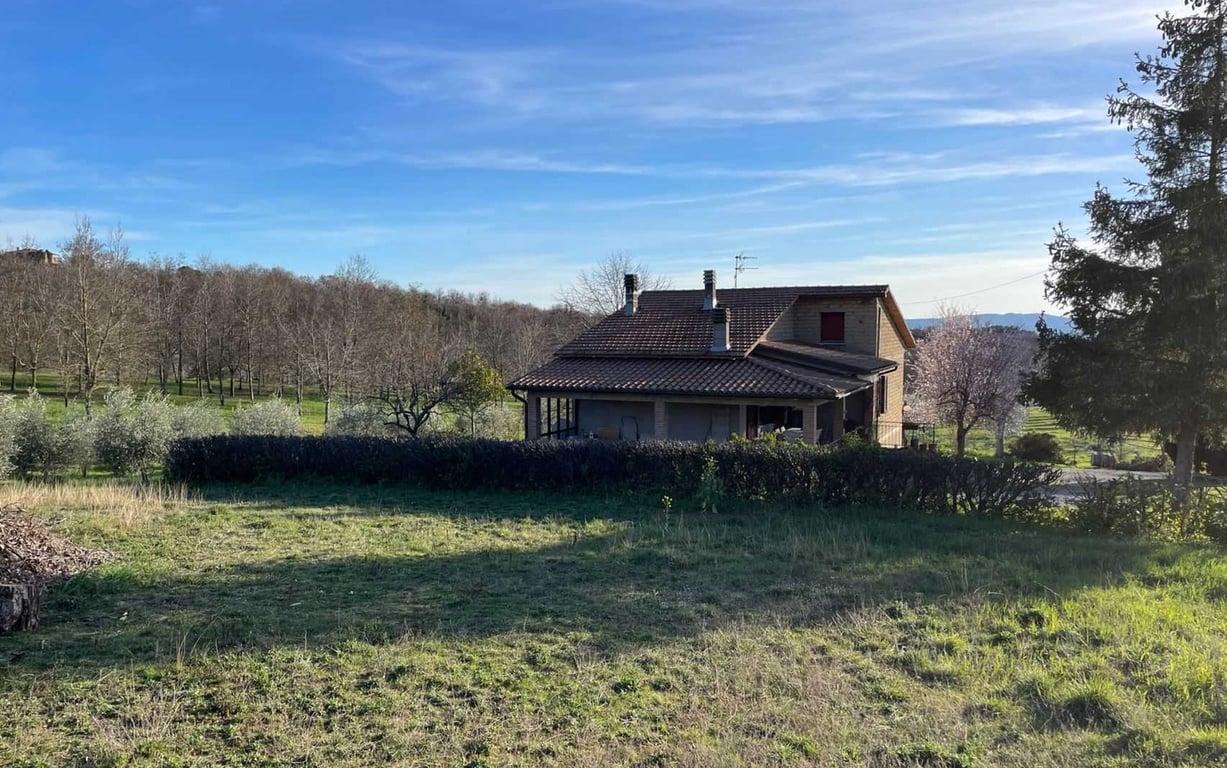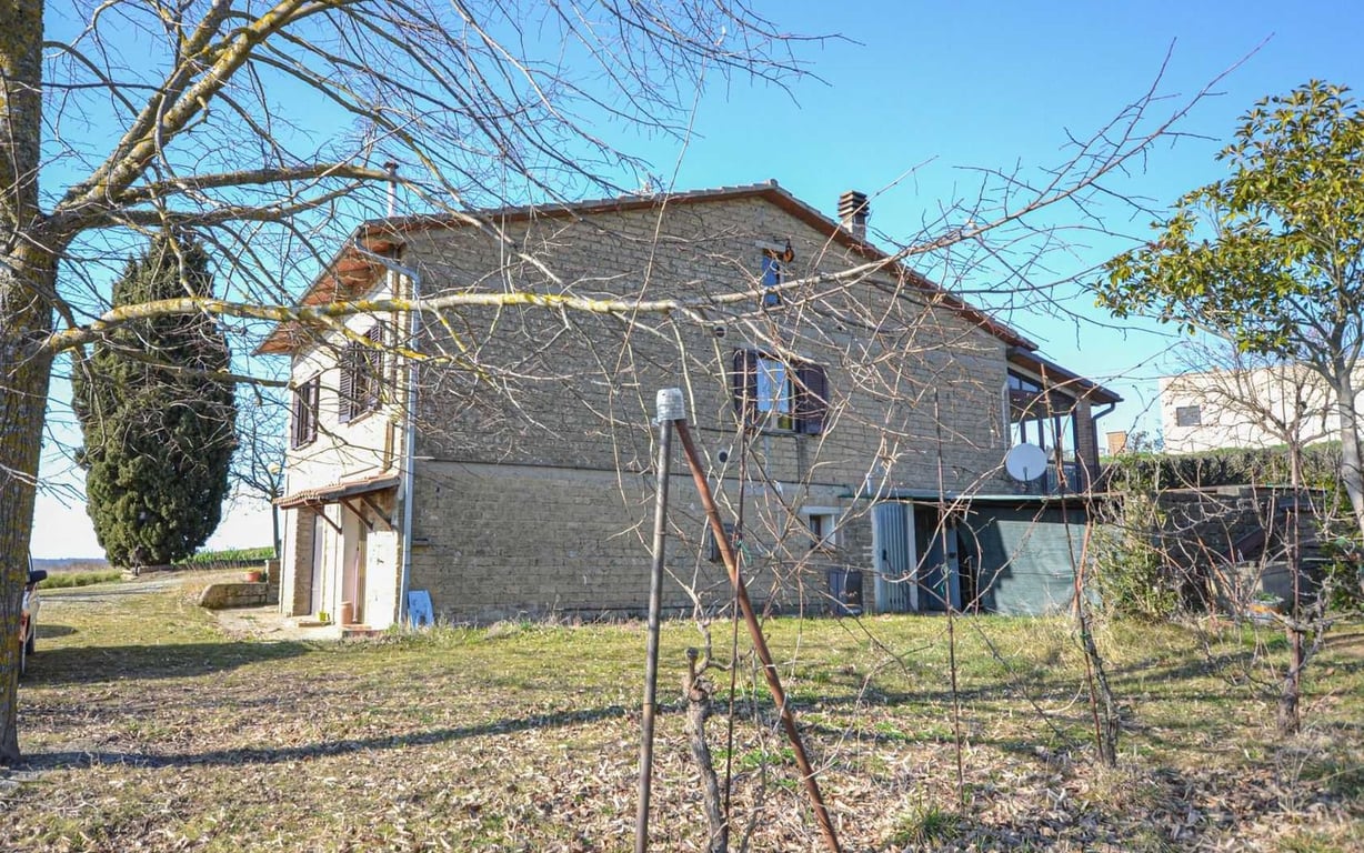 In a quiet and very panoramic position, not far from the village of Montegabbione, detached house with private garden.The building is on two levels and is divided into:Ground floor: flat of about 80 sqm consisting of entrance hall, kitchen with fireplace, living room, two bedrooms and bathroom. Splendid portico of about 40 sqm on two sides of the building to complete the living floor.Basement: large room for tavern use with bathroom, large shed, various rooms for cellar use and storage.The prope...