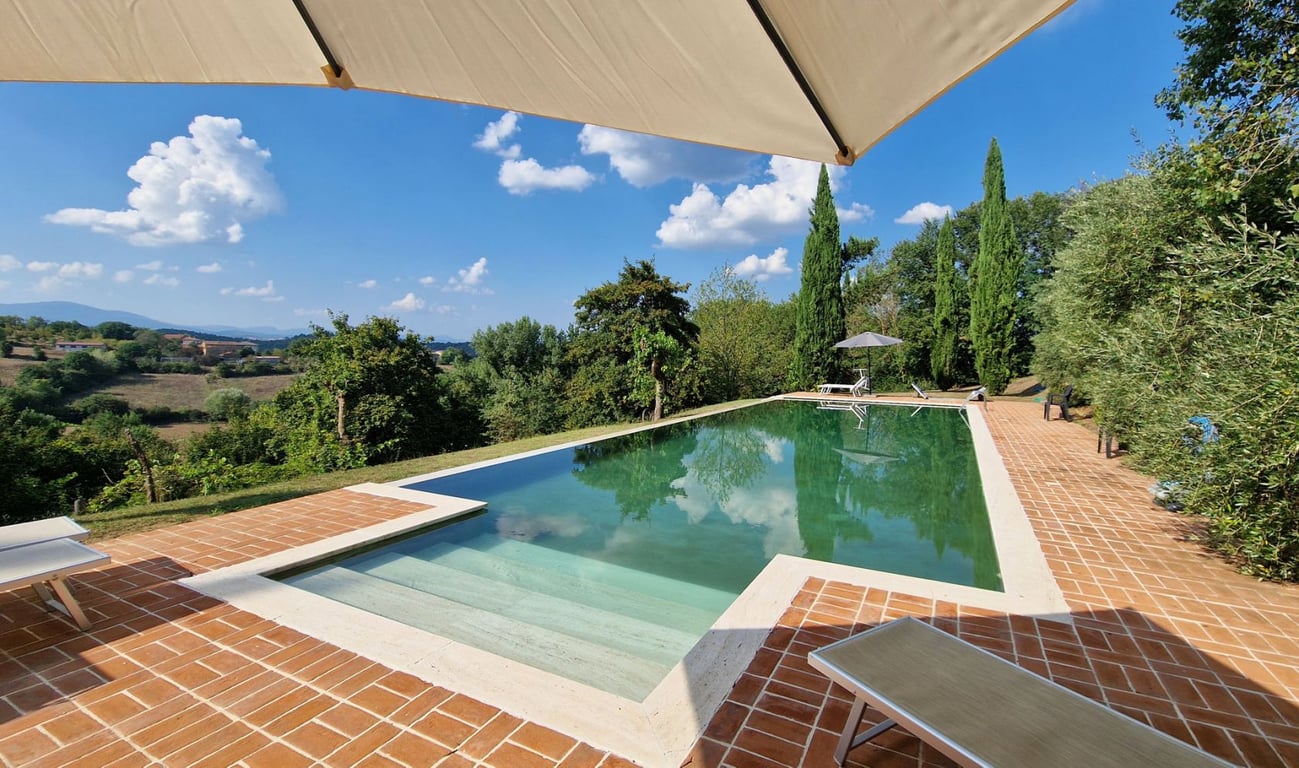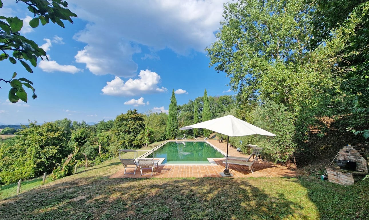 Charming luxury farmhouse for sale in the scenic Arezzo countryside, located in a small hamlet in the hills just a few kilometres from the village of Monterchi.The prestigious farmhouse is surrounded by one hectare of well-kept land, which houses a spacious swimming pool with solarium area, as well as outdoor areas dedicated to relaxation and recreation.With a splendid view stretching as far as Anghiari and Monte della Verna, the farmhouse has a surface area of approximately 300 sqm and houses f...