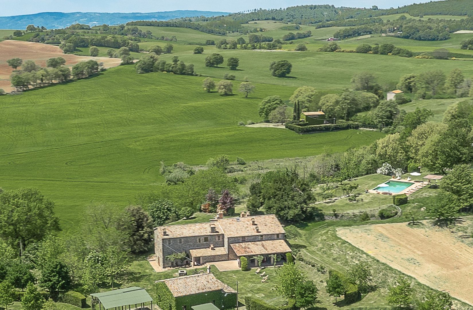 A farmhouse immersed in tranquillity, surrounded by the Umbrian hills in the vicinity of Orvieto, situated in a strategic position as it is almost equidistant between Rome and Florence.The farmhouse is on 3 floors and has a total area of 500 sqm.The basement consists of a laundry room and a storeroom.On the ground floor there are the entrance, a kitchen with fireplace and access to the portico, a living room with fireplace and a staircase leading to the first floor, a characteristic original man...
