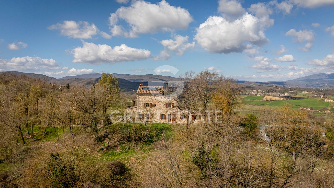 Immersed in the authentic tranquility of the Tuscan Valtiberina hills, in a private and panoramic position, this finely restored stone farmhouse, complete with a guesthouse, offers approximately 335 sqm in total. On the ground floor there is a spacious apartment comprising an entrance hall, bathroom, kitchen with dining room, and two bedrooms. On the same level there is a second apartment featuring a bedroom, bathroom, terrace, and direct connection to the upper floor of the main unit, an ideal ...