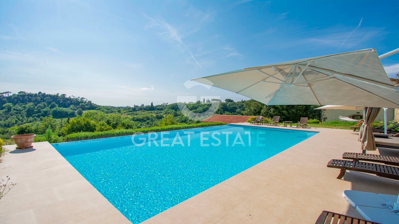 This splendid property, surrounded by greenery and offering a panoramic view of the Pisa hills, is located in the municipality of Palaia and comprises two buildings: the main farmhouse and a guesthouse. The main farmhouse of 302 sqm is spread over 2 levels plus a mezzanine as follows: on the ground floor, there is a large terrace, ideal for summer dining, which leads to the house. Here, you are welcomed by a spacious living area with an entrance, a lounge with French doors leading to the wood-fi...