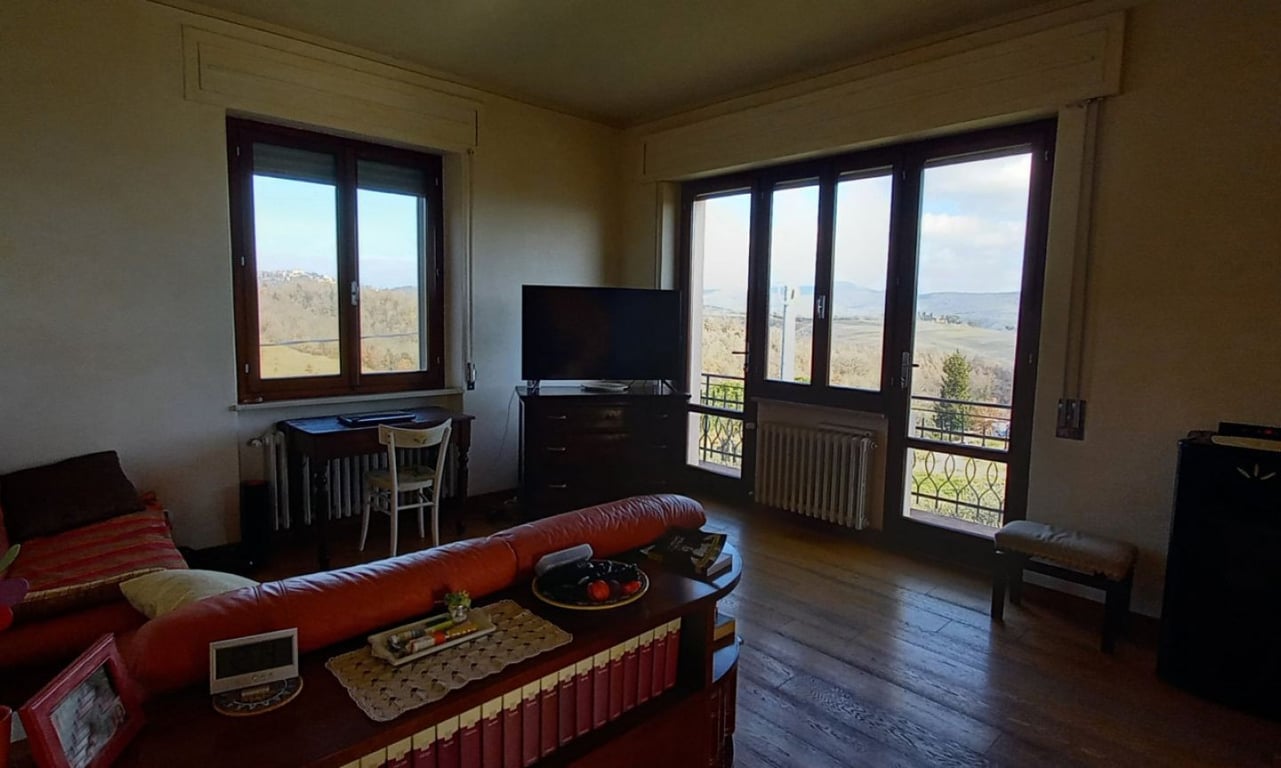 PANICALE, villa on two levels for a total area of about 525 sqm plus terraces of 18 sqm and surrounding land of 3480 sqm . The villa is divided as follows: ground floor (about 275 sqm) with main entrance leading to the first floor, garage, laundry, central heating plant, bathroom, hallway, storage room and large warehouse of about 150 sqm. The first floor (approx. 125 sqm) consists of a hallway, a large living room with terrace overlooking the historic centre of Panicale, dining area with firepl...