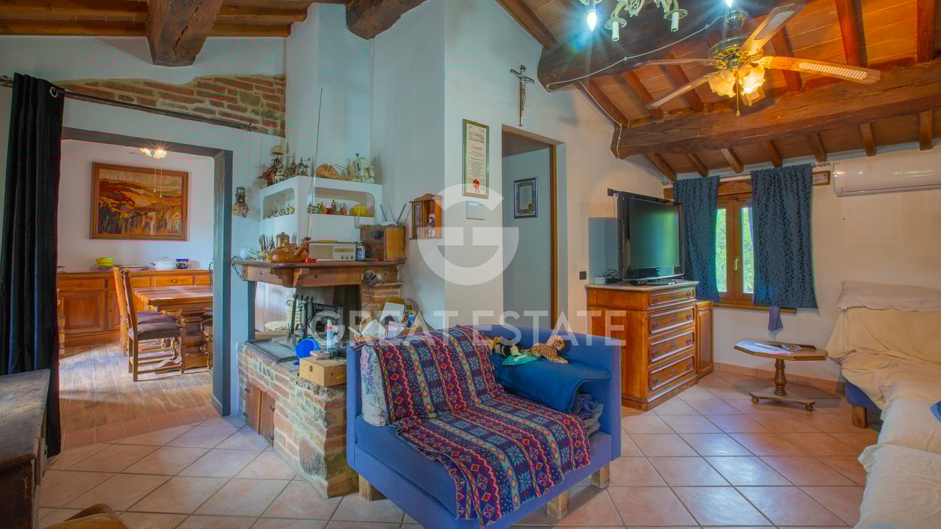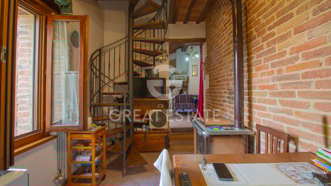 The "Porzione di Maya" unfolds over three levels: on the ground floor, there is a spacious rustic area of about 60 sqm, partly finished, featuring a country-style kitchen, a bathroom, and a large open space with a fireplace—an ideal setting for social gatherings, dinners with friends, or to be transformed into an independent living area; this open space can also serve as a bedroom. Accessed via a charming external loggia, the first floor houses the main living area of approximately 75 sqm. Here...