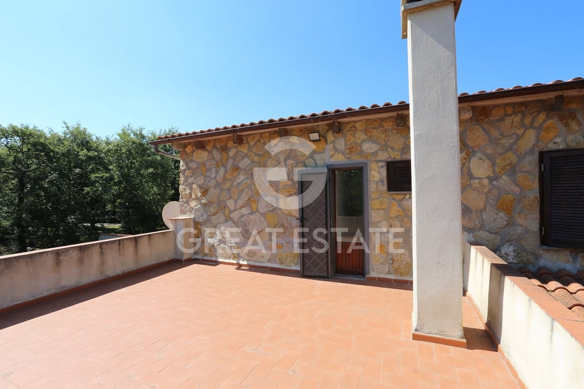 A portion of a country house, situated in a small recently built hamlet with four-family houses in a local stone. This Umbrian country house has four units and this one for sale is about 125 sqm in size, net surface of 73 sqm plus 52 sqm of porch and terrace. Besides the lawn and a garden of 900 sqm with automatic irrigation system, there is a woodland of 8000 sqm. The completely restored portion of the country house is arranged on two levels and is composed of a living room with a kitchen area...