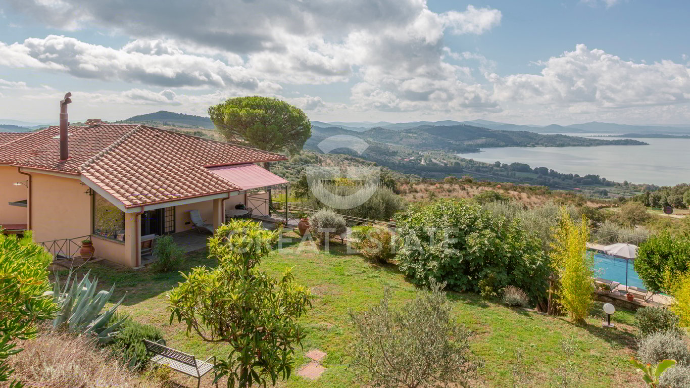 On the green hills of Lake Trasimeno, in a panoramic position, stands this beautiful recently renovated villa. The property, of approximately 370 sqm is divided vertically into 2 real estate units. The master part is composed of a large bright living room, a kitchen with large windows from which you can admire the splendid view of Lake Trasimeno, a bedroom and 2 bathrooms. An internal staircase leads to the first floor where we find a large living room with fireplace, 3 bedrooms and 3 bathrooms....