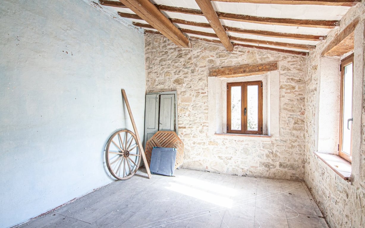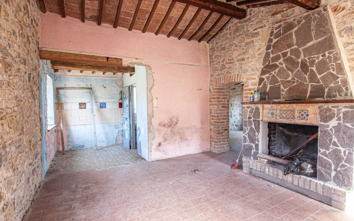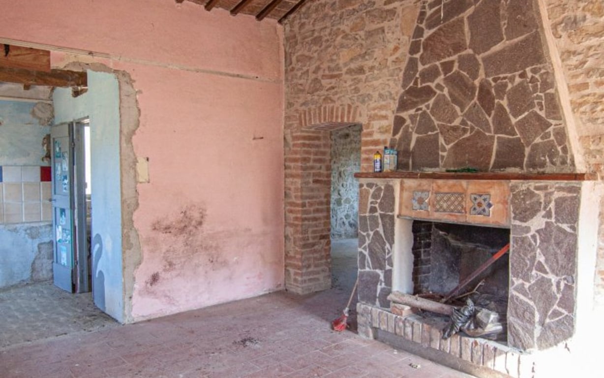 In hilly and extremely panoramic location, 6 km far from San Venanzo, in small countryside hamlet, typical independent farmhouse of approx. 180 sqm on two levels divided in two large cellar/stable on the ground floor and dwelling divided in living room with fireplace and kitchen corner, bathroom and two bedrooms. The property requires internal restoration and includes surrounding land of approx. 1.3 hectares with olive trees, arable land and old vineyard to be recovered. Open views of the surrou...