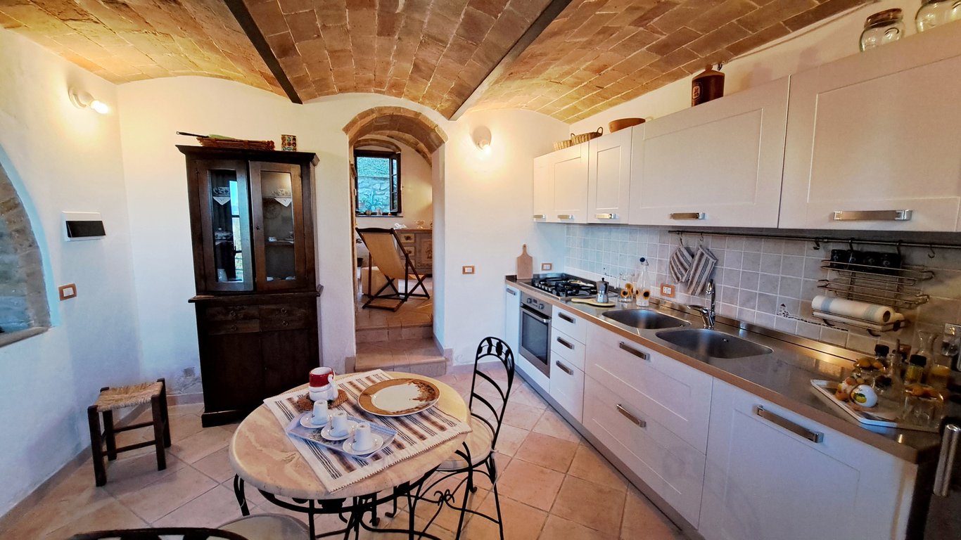 In the Volterra countryside, for sale , beautiful apartment on two levels forming part of a group of houses for a total of 3 families. The property is accessed via a short stretch of private gravel road that leads to the private entrance road. After the avenue, we immediately find on our right the parking area and the private terraced garden and the courtyard with the portion of the house for sale and a separate storage room. You enter the house directly into the beautiful room with cross va...