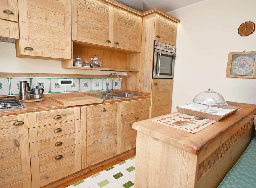 This fully furnished 3-room apartment in a quiet location boasts impressive views of the ‘Sasso di Santa Croce‘ in the Dolomites. The well-maintained apartment is located on the ground floor and has a cosy living/dining area, two bedrooms – one with direct access to the bathroom – and another bathroom. The apartment is predominantly panelled in wood and is in very good condition. The property also includes two cellar compartments, a garage with storage room (including water connection for a wash...