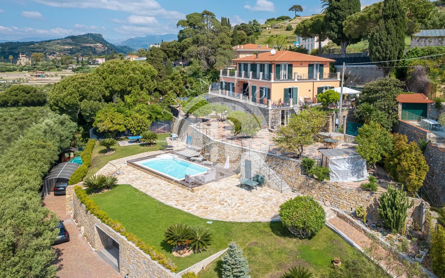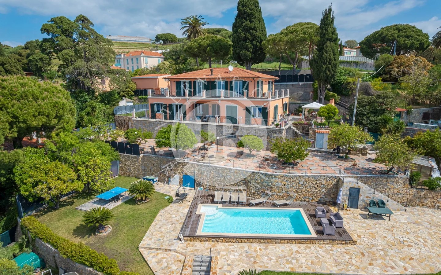 Prestigious Villa With Pool and Garden in A Dominant Panoramic Position In Bordighera This distinguished property is set in an elevated, panoramic position, offering a rare combination of generous living space, breathtaking sea views, and absolute privacy. Spanning approximately 480 sqm across multiple levels, the villa is designed to ensure both independence and versatility. The ground floor features a bright living area with a fireplace, leading directly onto a large porch. The eat-in kitche...