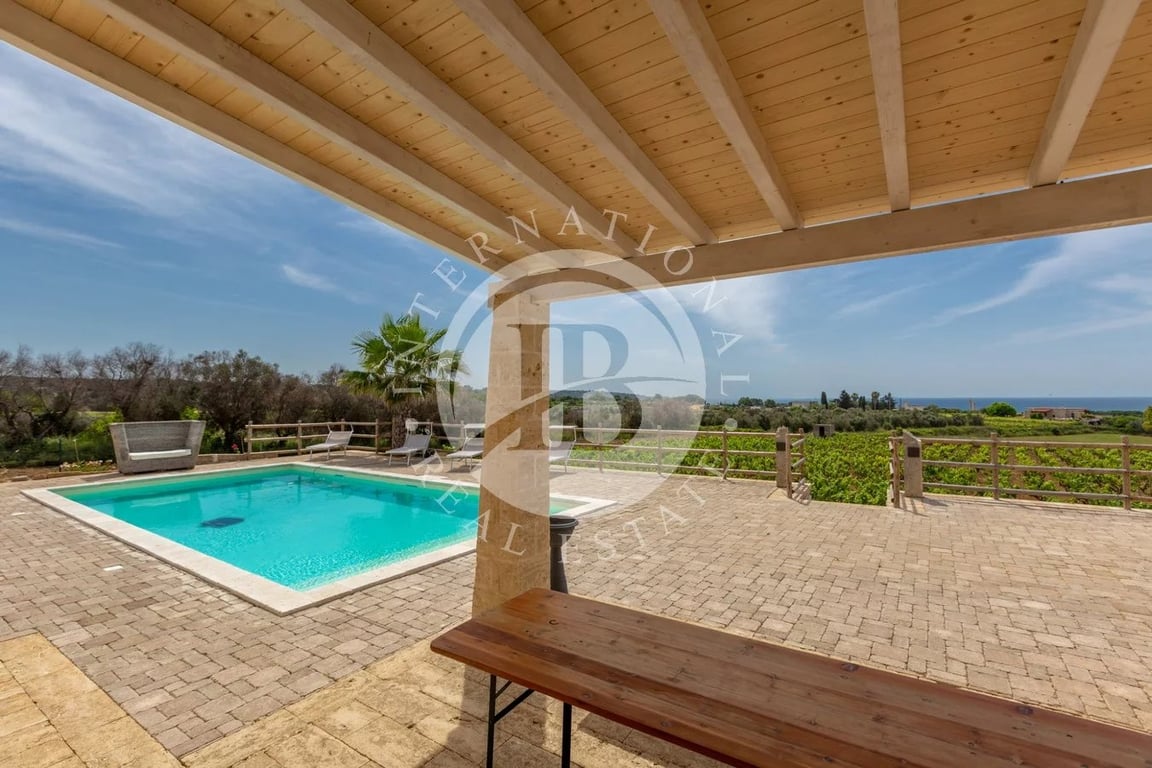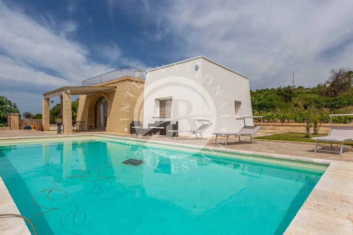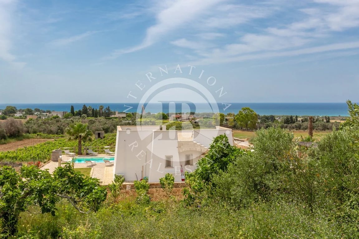 The sea view Villa with Pool and vineyard is in Pescoluse, seaside resort of Salve - Salento - Puglia Sea view villa with swimming pool and a garden of 4000 square meters, characterized by the presence of a vineyard of Negroamaro and white malvasia, as well as various plants of typical Salento fruits, such as figs, mastic and prickly pears. The villa has a covered area of 85 square meters and is built in blocks of tuff, typical local stone, with star internal vaults, in addition to a pergola...