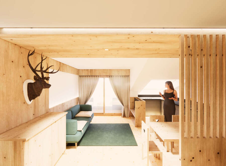 Renovation and restructuring of the historic building "Innerkalcher" in the town center of Moos/Sexten. A total of 9 apartments will be created. Three-room apartment with living-kitchen room, two bedrooms, two bathrooms, two balconies and a basement. A garage is available separately: price upon request.