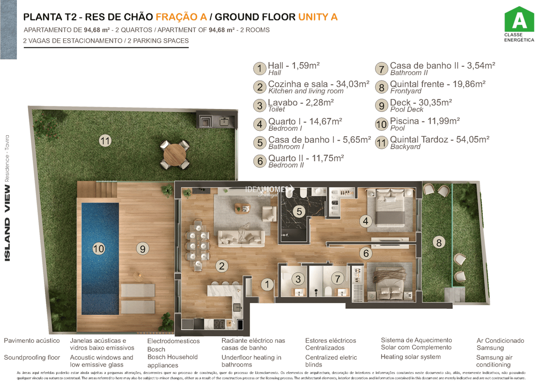 A stunning new 2-bedroom apartment with 94,68 m2 of interior space plus a 95,05 m2 private terrace featuring its own swimming pool, garage, and storage room, located in Tavira beside the Ria Formosa in the Algarve. Designed for comfort, elegance, and functionality, this apartment offers bright and inviting bedrooms, a fully equipped modern kitchen, and a spacious living area that flows naturally onto the terrace. Additional features include air conditioning, electric shutters, heated floor and...
