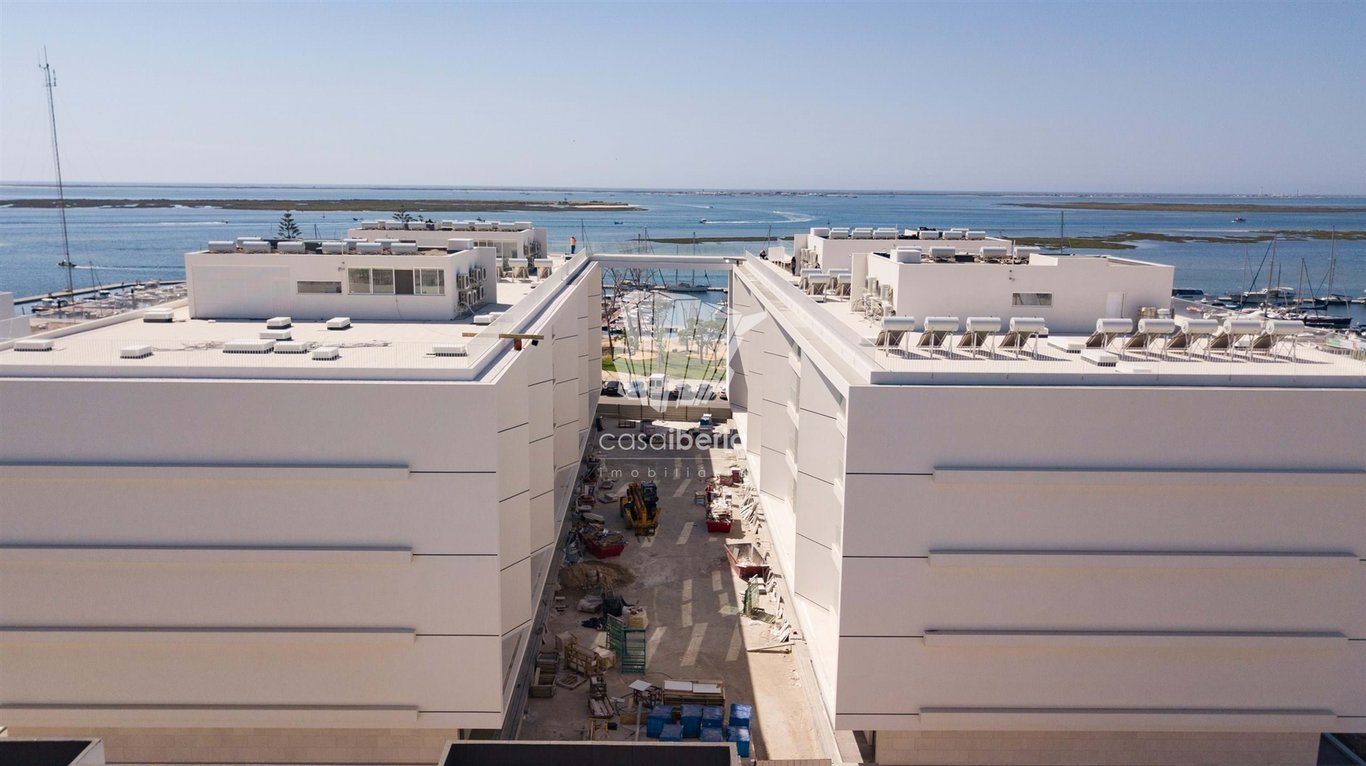 Spectacular luxury private condominium located in the center of Olhão, on the 1st water line, with magnificent views over the Ria Formosa.Condominium composed of 83 apartments, with typologies from T1 to T4, with original finishes and high quality materials, private parking in common garage, storage room and permanent security.The building has 2 swimming pools, one covered and heated and the other exterior with a unique view.Features:- Equipped kitchen- Laundry- Closet- Wardrobes- Air conditioni...