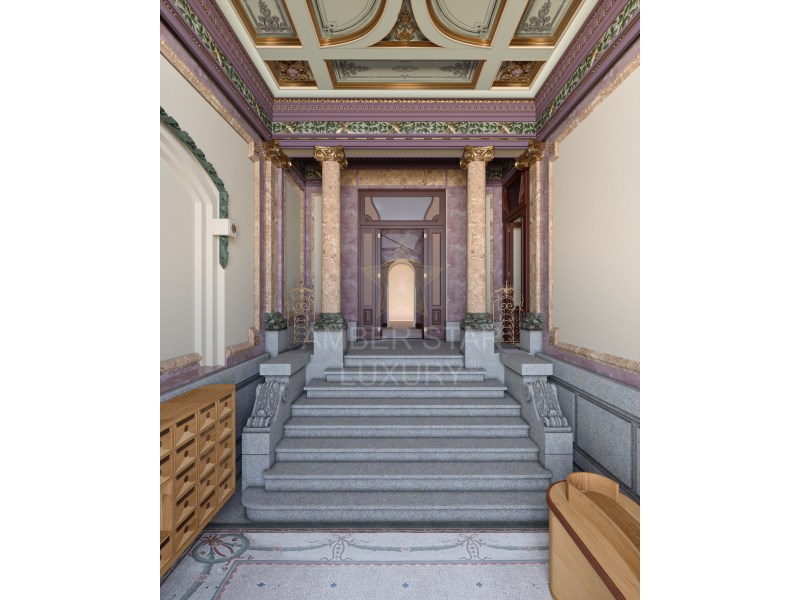 Apartment with main entrance to the development via the existing and fully restored entrance hall, including polychrome mosaic and stone floors, plaster walls, and polychrome stucco ceilings, with a workstation for concierge service. The existing staircase will be fully restored, including polychrome mosaic floors, stucco-covered walls and ceilings, and skylights. This three-bedroom apartment will consist of a living room/kitchen, three bedrooms, three bathrooms, laundry room, balcony, and is l...