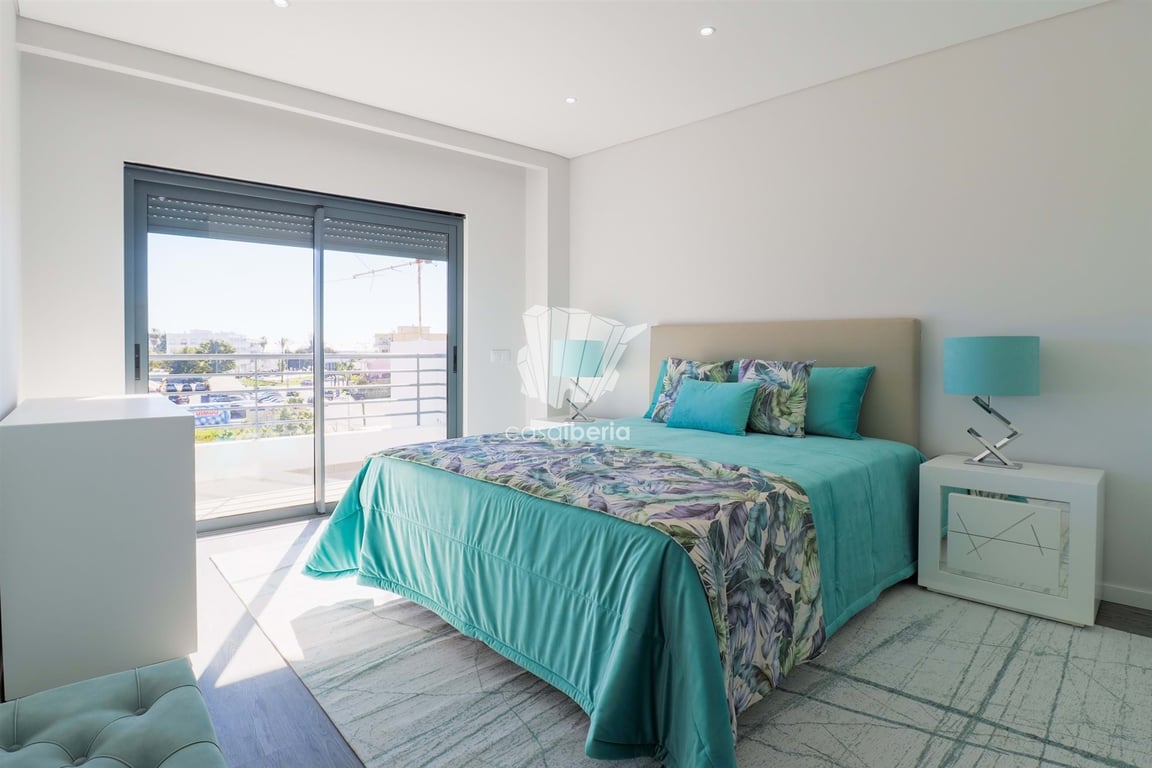 Condominium of modern and elegant architecture with garden and swimming pools.A few minutes from the shops, beaches, market and restaurants, the apartments are spread over five floors.From typologies T1 to T4 have generous areas and large balconies, some with unobstructed views over the Ria Formosa.The apartment consists of entrance hall, large common room, integrated and equipped kitchen, terrace, one bedroom en suite with wardrobe, and two bedrooms with balcony and built-in wardrobes, and a ba...