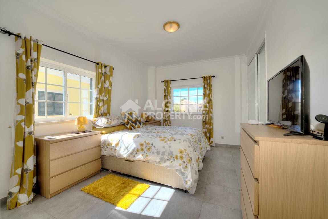 Situated directly on the golf course in Vilamoura, this 3-bedroom apartment offers 106 sq.m. of well-distributed built area. Located within a highly private gated community consisting of only 12 apartments, the property provides a quiet residential environment with immediate access to world-class golfing and central Vilamoura amenities. Interior Layout: The apartment features a central living room complete with a traditional fireplace, offering direct access to the main outdoor terrace. The kit...