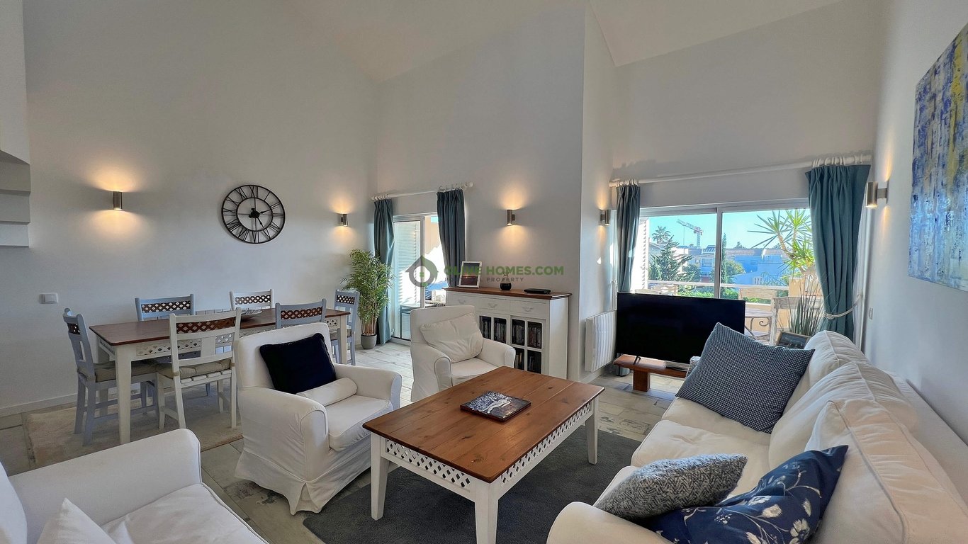 This stunning two-bedroom duplex apartment is a rare gem located on the top floor of a prestigious development near Vilamoura Marina. Perfectly positioned to enjoy the vibrant marina lifestyle, this property offers a combination of modern elegance and coastal charm with a beach type theme to the living area. The spacious interior is beautifully designed and furnished, with an open-plan living and dining area that flows seamlessly onto a private balcony, providing stunning views and an ideal spa...