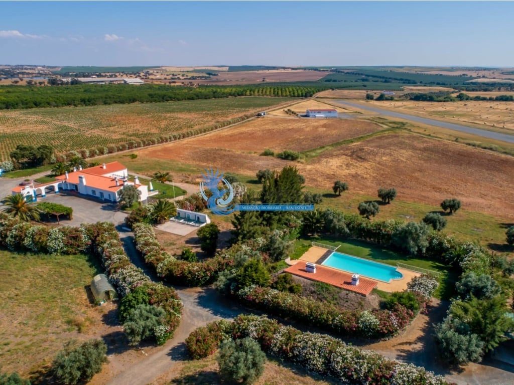 Homestay of excellence, located in alentejo, is all fenced and has an area of 291,250 m2, composed of several distinct areas such as: a traditional villa with chapel, a house with swimming pool, a kennel, gardens, agricultural land and an airstrip with hangar and parking. The charming main housing is typical Alentejo and of excellent construction, consists of an entrance hall with stained glass windows, a large office, 5 spacious bedrooms with built-in closets, 3 of the bedrooms have its priv...