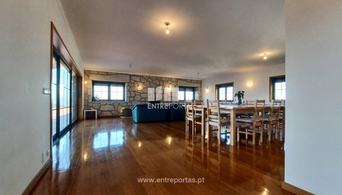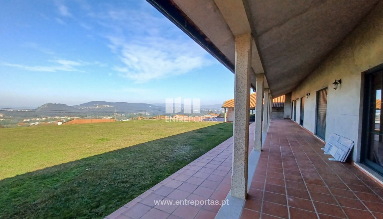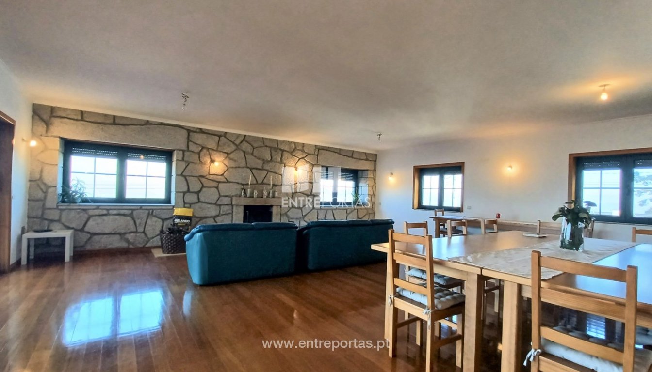 Sale of fabulous ground floor villa V5 semi-new, Antas, Esposende. First floor with 5 suites, all with terrace and fantastic views of the sea and mountains. Very spacious kitchen, fully equipped, common room (dining and living) with fireplace, pantry with access to the attic, office and service toilet. In the basement there is a lounge for events, with bathroom, garage for 4 cars with storage space. It is all equipped with aluminum frames, double glazing, electric shutters, with gas and pellet h...