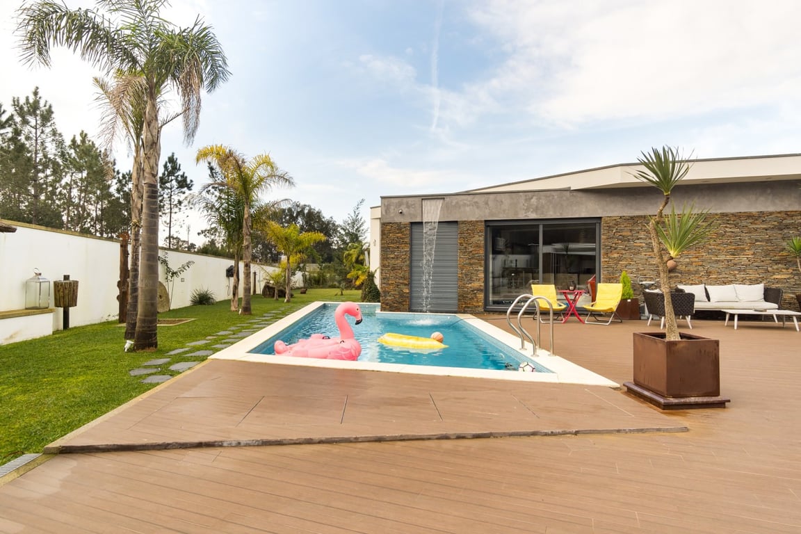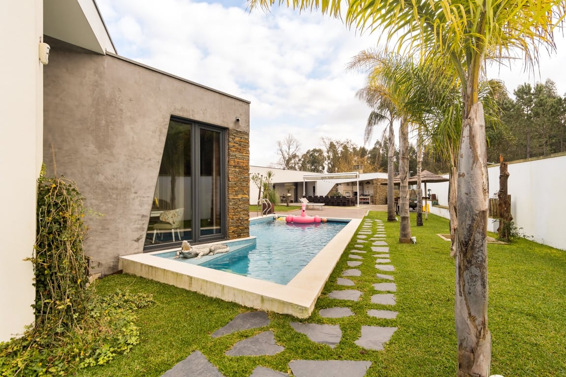 In Ovar, for sale is a distinguished luxury villa with four facades and outstanding construction quality that favours light, comfort, and tranquilly. This villa's expansive spaces and opulent embellishments, such as wood and natural stone, create a distinctive ambiance. Large windows and balconies saturate the house with natural light and facilitate interaction with the outdoors. In the main house, there are a spacious open-plan living room and kitchen, a living room, a games room with a bar a...