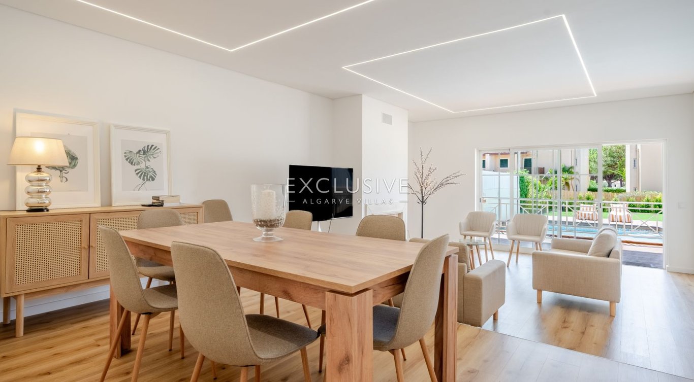 This stylish three-storey villa is located in Vilamoura, one of the Algarve’s most sought-after areas. With a modern design, high-quality finishes and a private pool, it offers the perfect blend of comfort, privacy and elegance. On the ground floor, a bright 35 m2 living room with fireplace opens onto the lounge and pool, creating an inviting space for family or guests. The fully equipped kitchen includes premium appliances, while this level also features a guest cloakroom and a bedroom with ac...