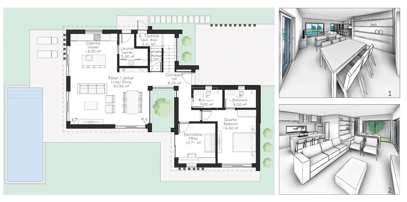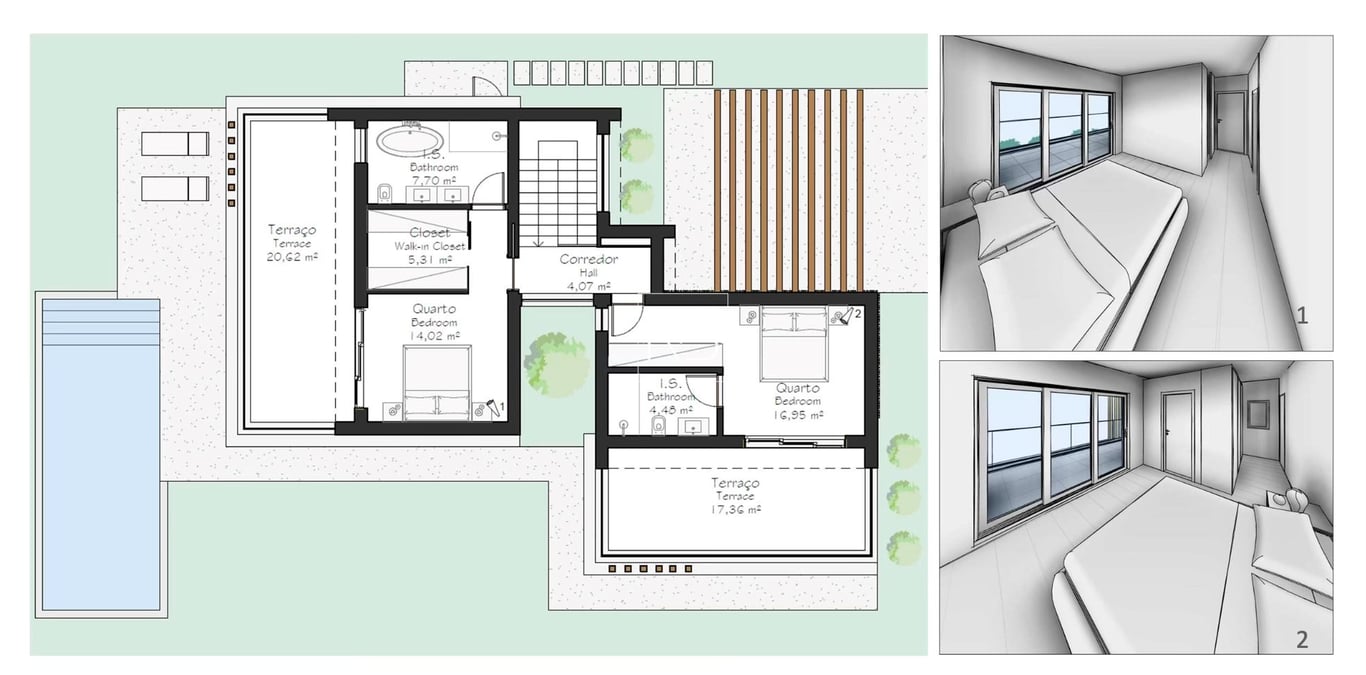 This 860m2 plot already has an approved project for a maximum construction of 245m2 and a floor area of up to 180m2. The approved project is for a modern two-storey 4 bedroom villa with private pool. The current proposal includes 200m2 of construction, with four bedrooms equipped with built-in wardrobes. Three of the bedrooms have en-suite bathrooms, while the bedroom has an additional full bathroom. On the ground floor there are 2 bedrooms and the leisure area, while on the 1st floor are the ot...
