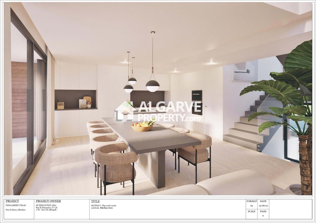 High-End Attached 3 bedroom villa Under Construction, located between Vilamoura and Olhos de Água this modern villa combines comfort, functionality, and an exceptional lifestyle. Just 10 minutes from the beach, it offers the perfect setting for a relaxing, enjoy easy access to the coast, ideal for leisure and outdoor living. With a total construction area of 202 sq.m. you will find on the ground floor a fully equipped open kitchen with an adjacent laundry room, spacious bright lounge with direc...