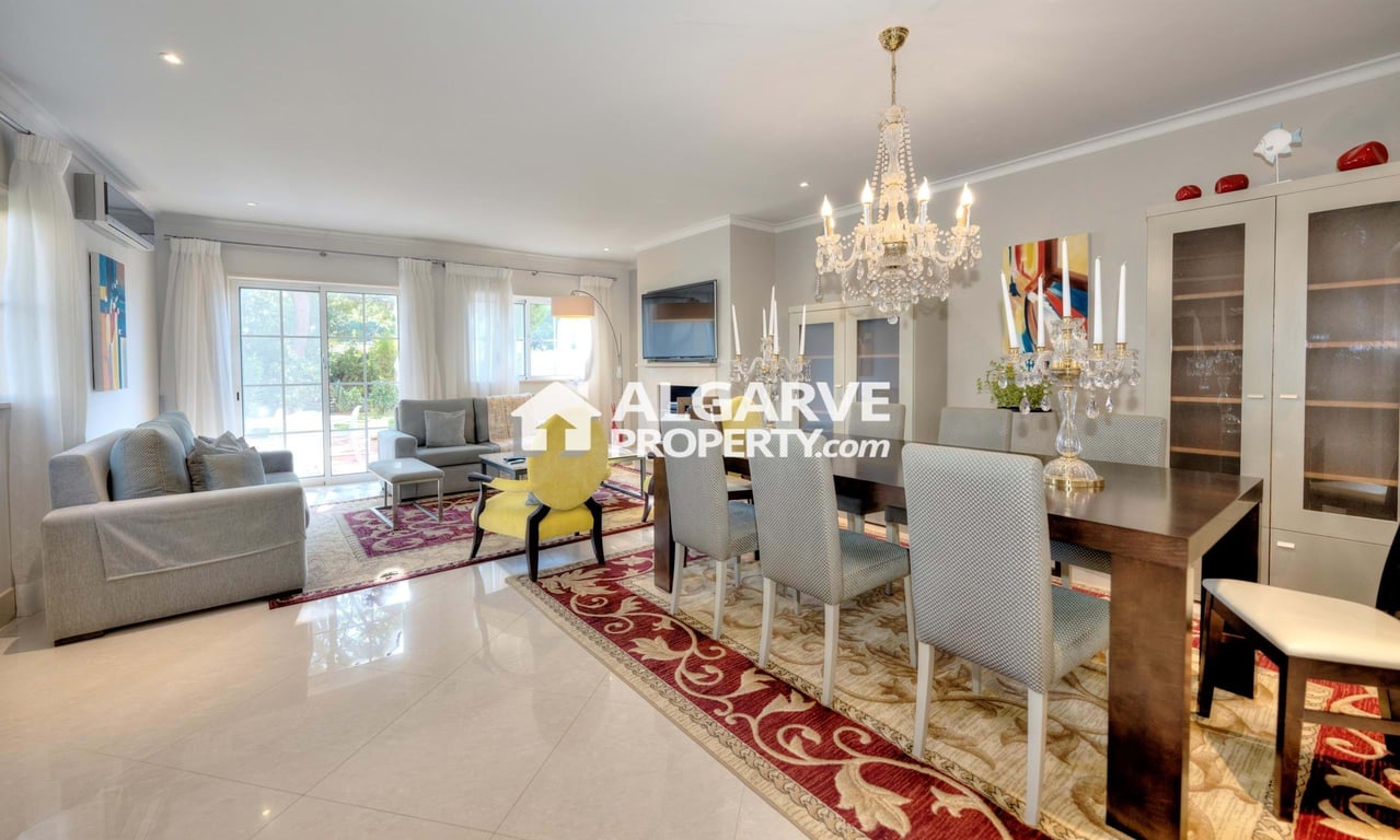 Luxury 3+1 bedroom townhouse excellently located in a luxury golf resort, next to the Vila Sol Club House and Vila Sol Hotel. Only 3/4 minute's drive from Vilamoura marina and several beaches. With approx. 240 sq.m. of built area. Top quality finishes, sold furnished and equipped. Fabulous communal garden areas with swimming pool. The villa consists on the ground floor of a large lounge with a living and dining room with a fireplace, one fully equipped kitchen "Siemens", one bedroom and a ...