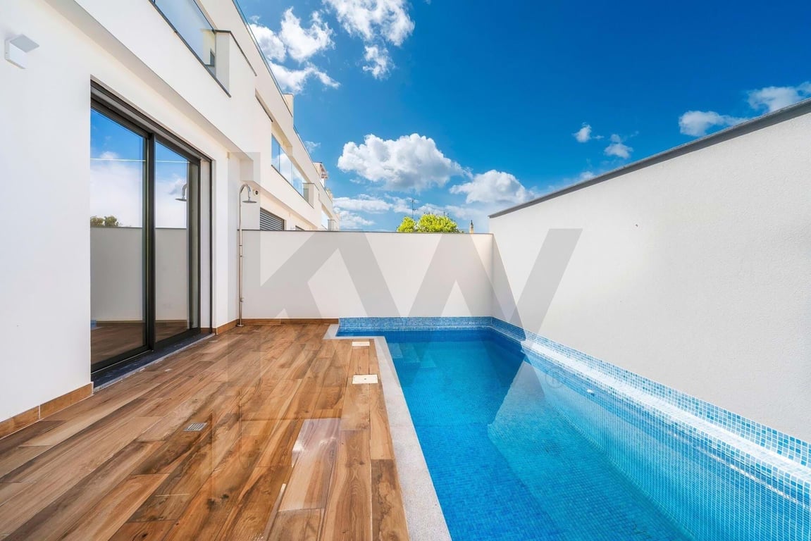 New villa consisting of 3 bedrooms, two of them en suite, with sea views, terraces and swimming pool, located in the village of Fuzeta close to the Ria Formosa and the magnificent beaches. The ground floor consists of a fully equipped kitchen and living room with dining area, 1 bedroom with built-in wardrobes, a complete bathroom with bathtub and pantry, a private patio with 1 parking space and a leisure area with swimming pool. The 1st floor consists of 2 en-suite bedrooms, with built-in ward...