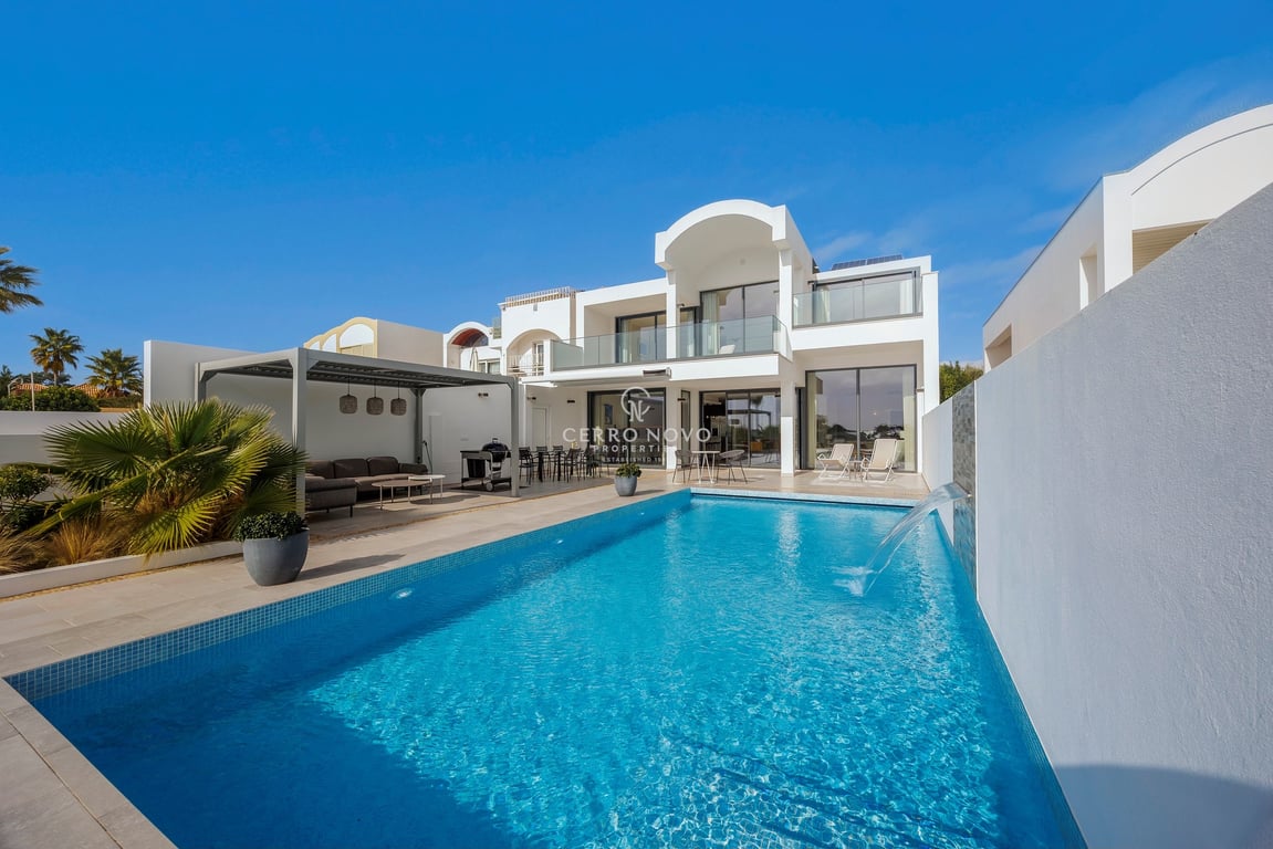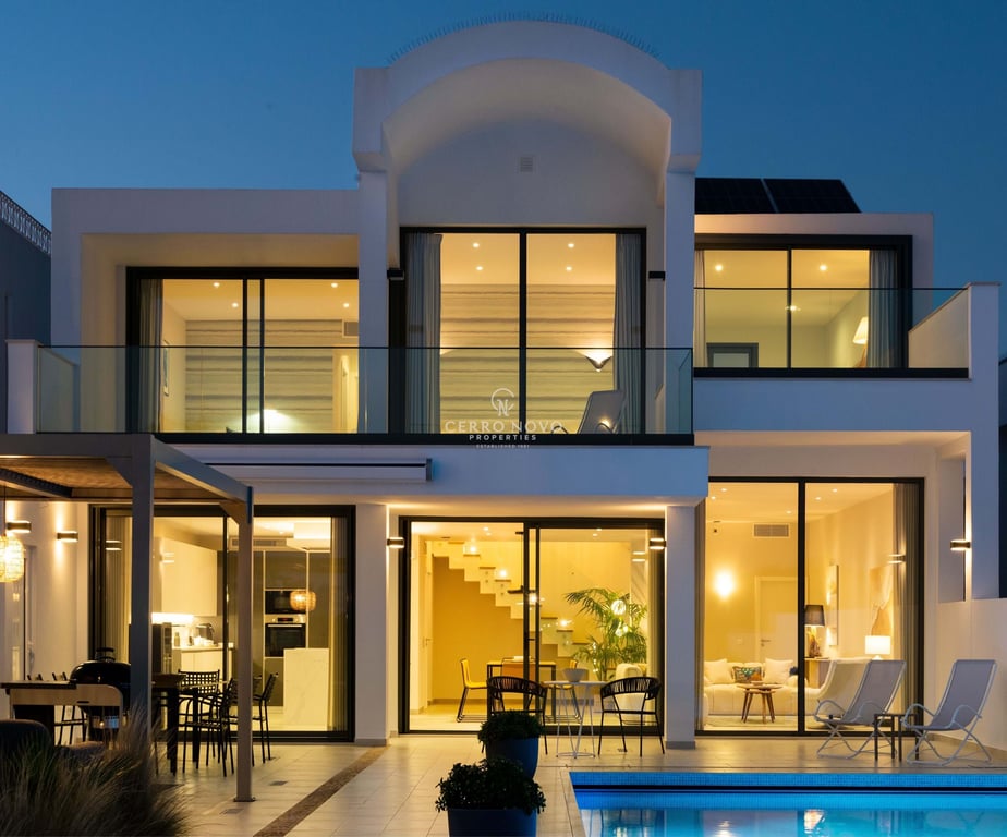 Superb, south facing, sea view villa V5 (V1+4). This open plan, light filled residence is in a wonderful location, just minutes on foot to a gorgeous, sandy cove and to various excellent restaurants. Offering convenience, luxury and calm. A dramatic, elevated and beautifully stylish property with wall to wall, floor to ceiling glass doors opening on the ground floor to a large sun washed, landscaped terrace and garden space with heated lap pool and on the first floor to a spacious terrace with ...