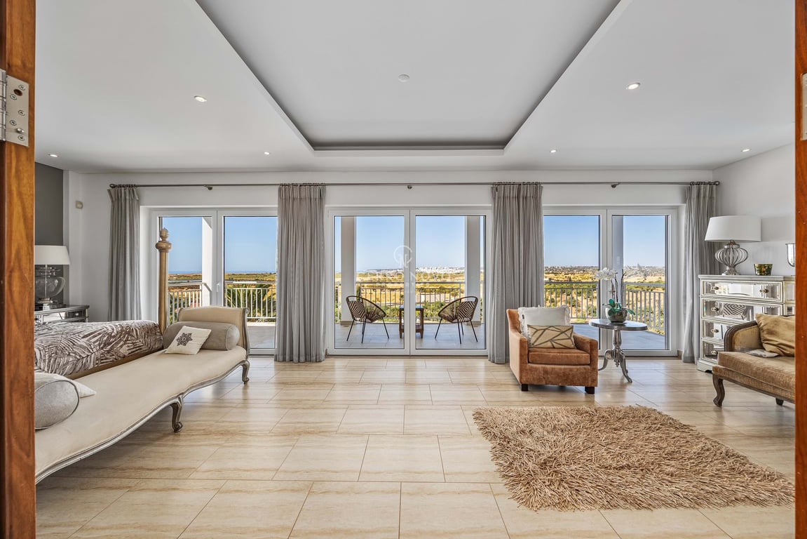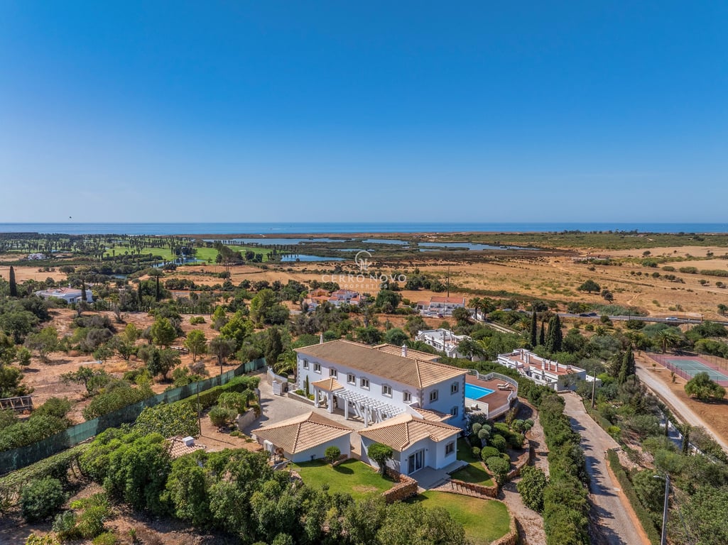 This stunning villa, a splendid combination of contemporary and classical style sits in an elevated position fronted by a large sunny terrace and infinity pool overlooking the Salgados nature reserve and golf course to the ocean beyond. The property is surrounded by large private, easily maintained and landscaped gardens featuring a tennis court. Facing south west the poolside terrace has a covered bbq and bar area, ideal for entertaining and enjoying the glorious sunsets. The entrance is vi...
