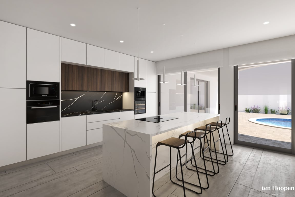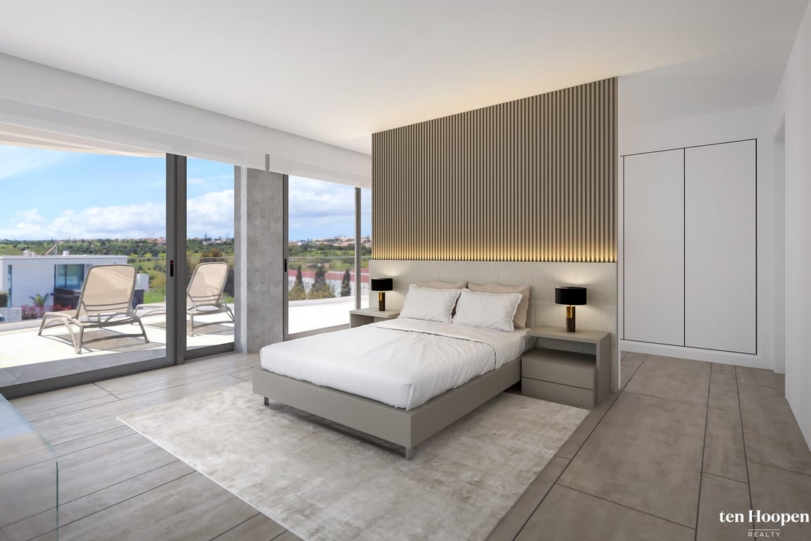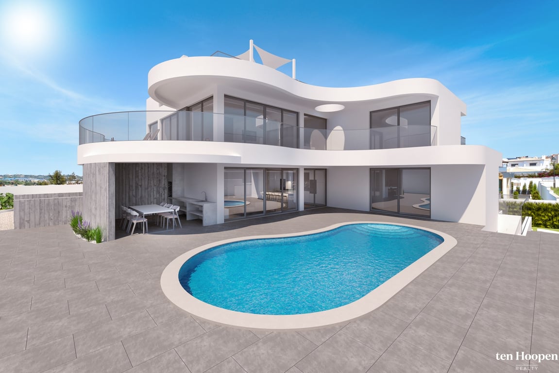 This modern style villa with rounded lines and ideal South West orientation is located between the historic city center of Lagos and Porto de Mos, both within walking distance. The villa is spread over 3 floors. The ground floor houses the living area, with lounge, dining room and kitchen, and a bedroom with en suite bathroom looking out on the garden and swimming pool area. Also on the ground floor is an office with guest bathroom. On the second floor you find 2 more bedrooms with en suite ba...