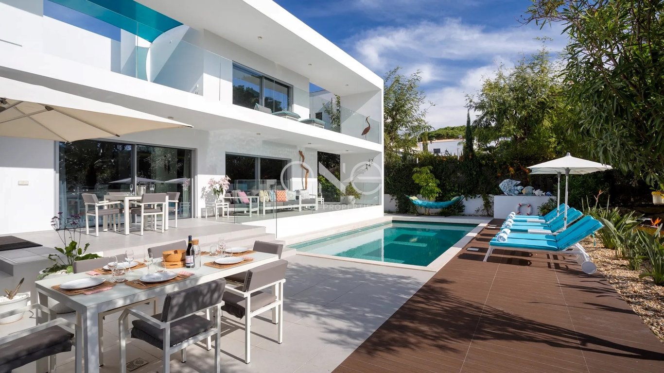 Originally conceived as a single-storey holiday home, this refurbished coastal villa has been completely renovated and extended to create a contemporary residence set alongside the Ria Formosa Natural Park in the Algarve. Positioned in a highly sought-after coastal setting, the property offers a rare combination of privacy, natural surroundings and proximity to Quinta do Lago and its world-class amenities. The entrance opens into a bright open-plan living and dining area, where high ceilings an...