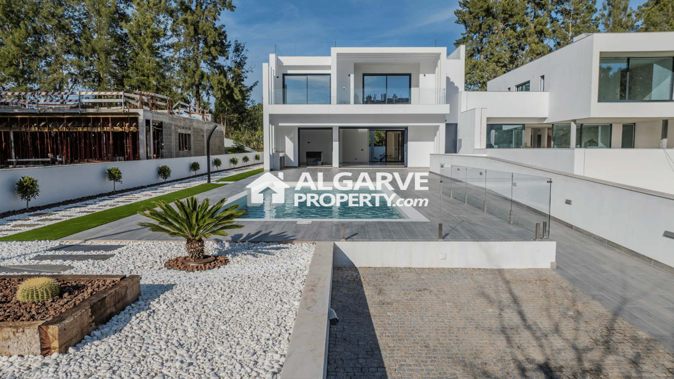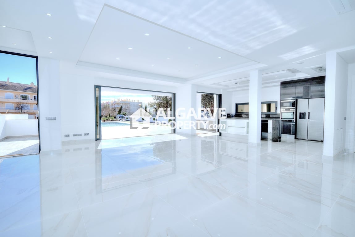 This brand new contemporary villa is in a prime location in Vilamoura, Algarve, just a 5-minute walk from the marina, beach, and amenities. Set on a 697 m2 plot, it offers 419 m2 of living space, designed with high-end finishes and a spacious, functional layout. The open-plan living and dining area is filled with natural light, seamlessly extending to the garden and heated saltwater pool. The modern kitchen, fully equipped with high-quality appliances, connects to an outdoor barbecue area, idea...