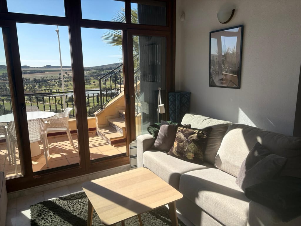 We are proud to offer this fantastic top floor apartment on the prestigious La Finca Golf resort. The property is presented fully furnished and equipped ready to move in! The open plan lounge diner has a vaulted ceiling with feature beams, and a beautiful fireplace. The kitchen comes fully equipped with all appliances.There are two double bedrooms with fitted wardrobes, a family bathroom and en-suite shower room.The lounge has full width patio doors that lead to an outside terrace with the most ...